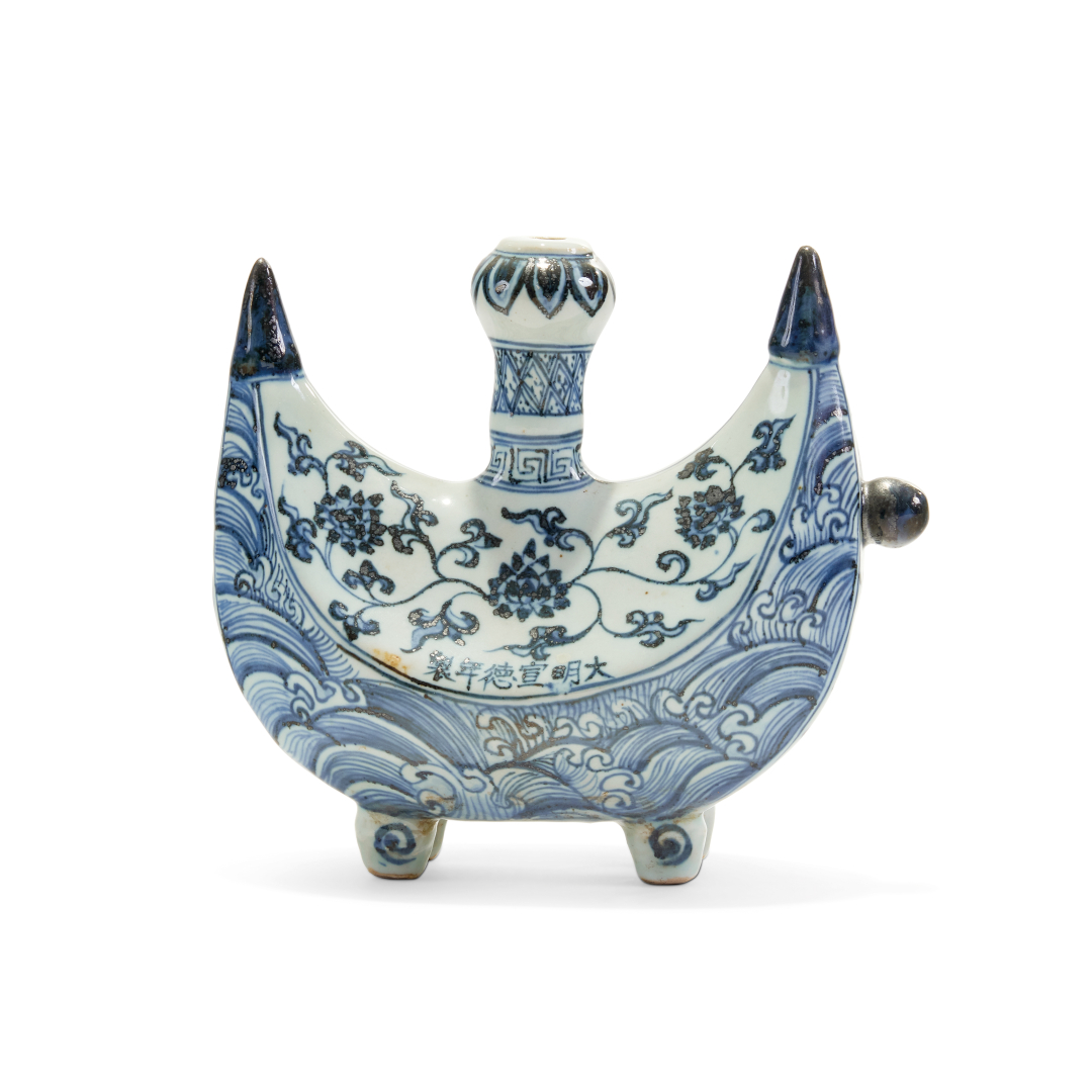 Porcellana dipinta in blu di cobalto sotto invetriatura con un decoro di onde e tralci stilizzati, marchio apocrifo di Xuande.