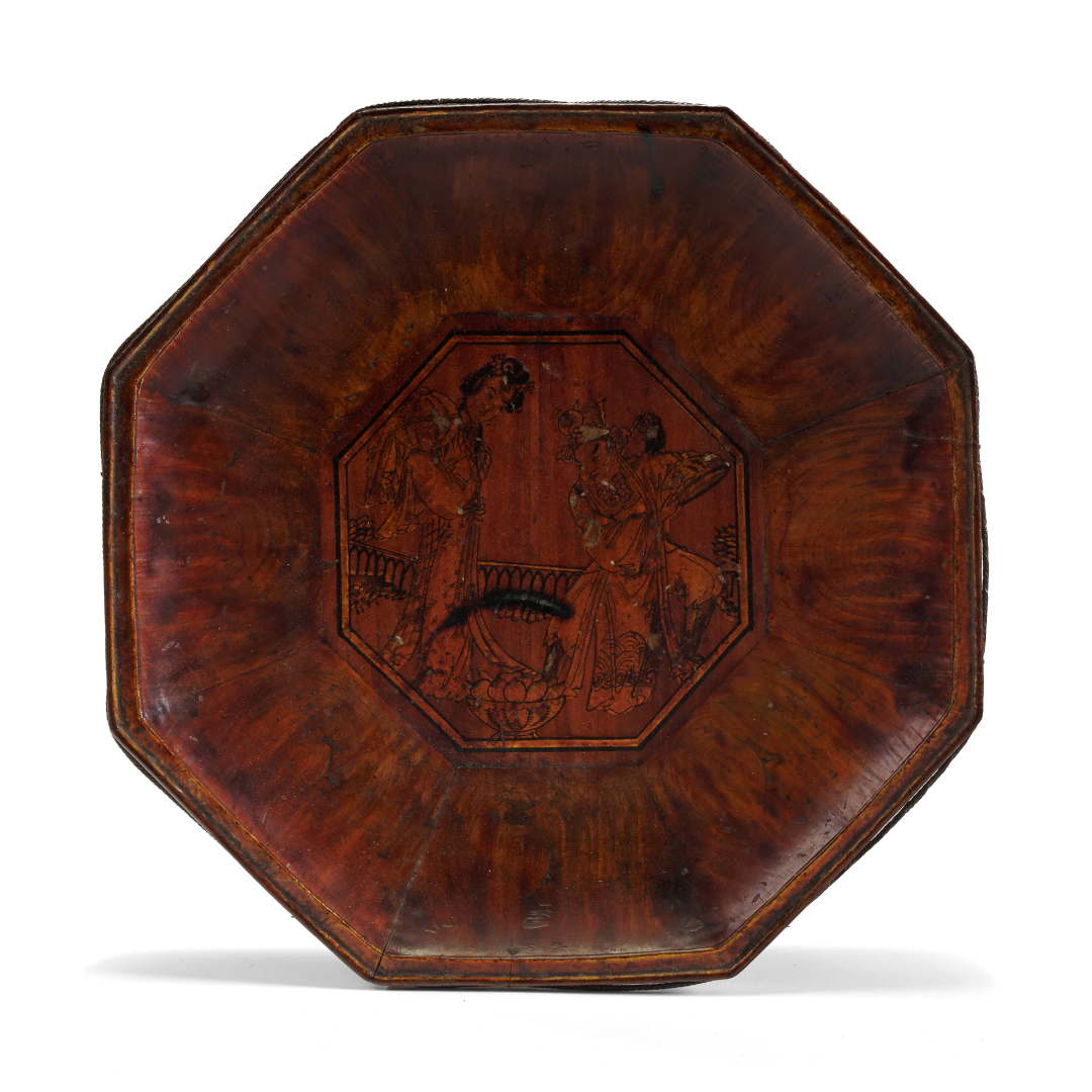 Legno, sul fondo scena a lacca con due figure, l'orlo sottolineato da sottile treccia in metallo, marchio a quattro caratteri al centro della base.