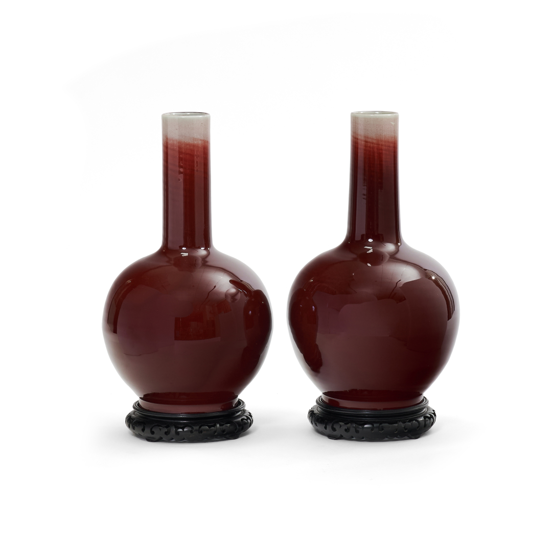 Porcellana rivestita di invetriatura 'sangue di bue', uno con marchio apocrifo di Guangxu, l'altro con marchio apocrifo di Tongzhi, entrambi incisi al centro della base, basi in legno.