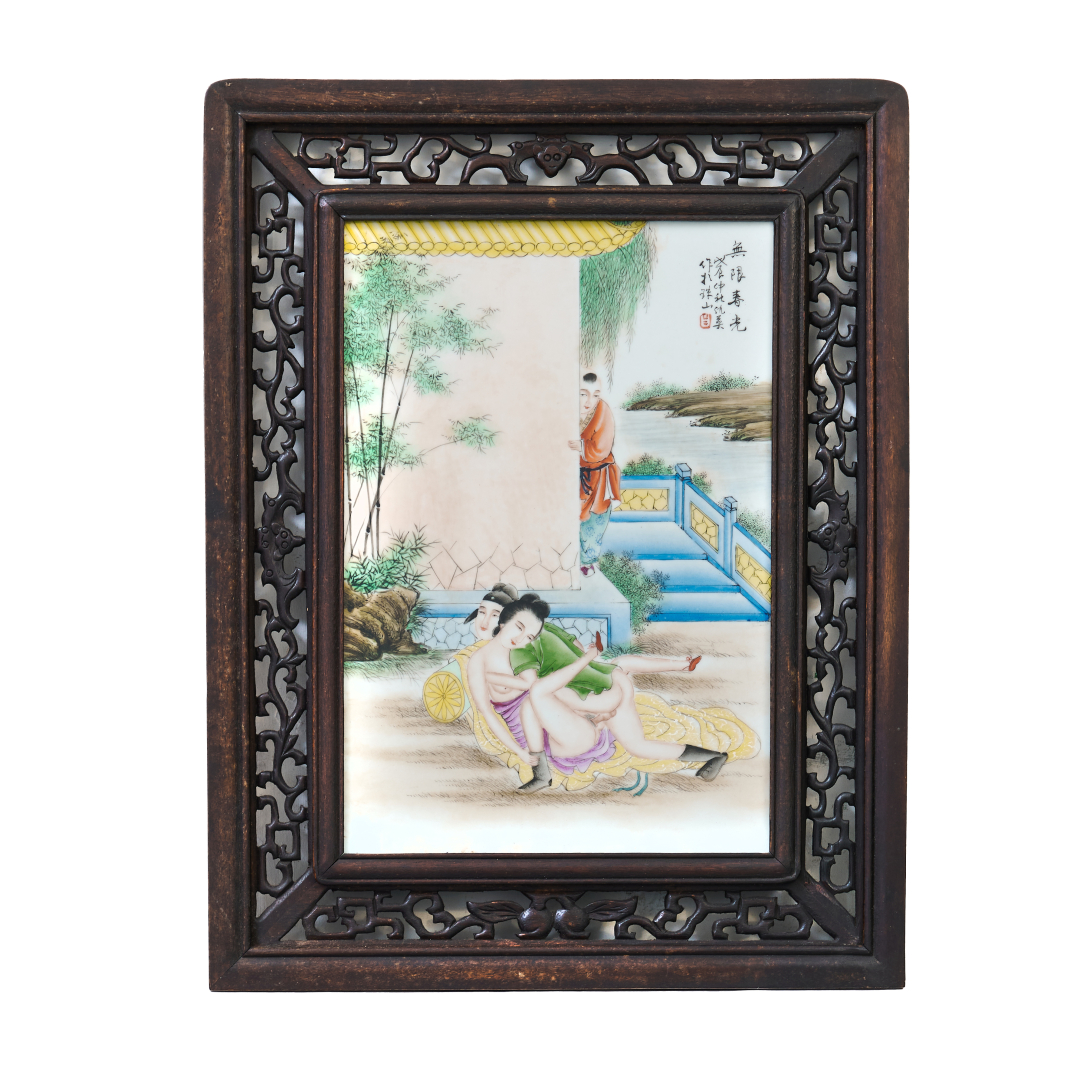 Porcellana dipinta a smalti policromi, scena erotica ispirata da un dipinto di Qiu Ying (1494-1552), ambientata in un giardino, iscrizione e firma con sigillo nell'angolo superiore destro, cornice in legno intagliato 'a giorno'.