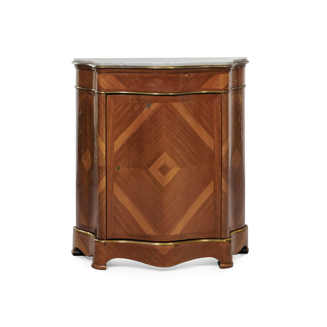 Noce, di forma mossa, un'anta frontale con ripiani all'interno, profili e montature in bronzo dorato, piano in marmo bianco.