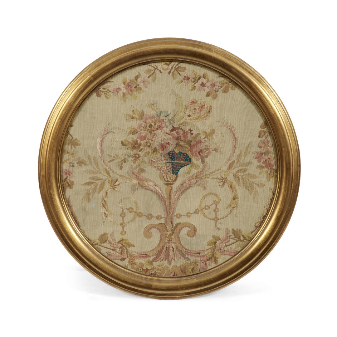 Coppia di ricami a piccolo punto su tessuto con composizioni floreali, entro cornici tonde modanate in legno dorato.