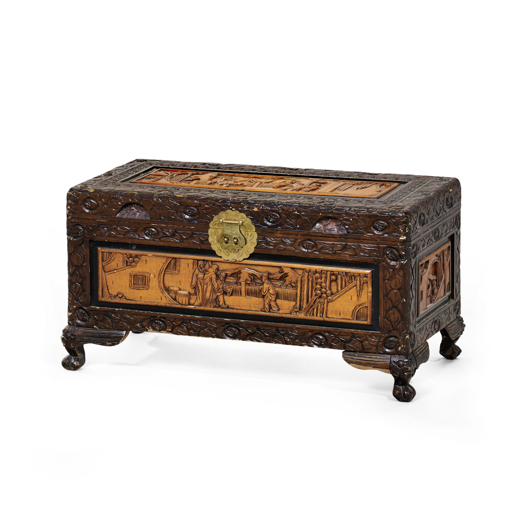 Legno intagliato a rilievo con motivi fitomorfi e pannelli con decoro a chinoiserie sul coperchio e sui lati, su quattro piedi ferini, fibbia in ottone cesellato.