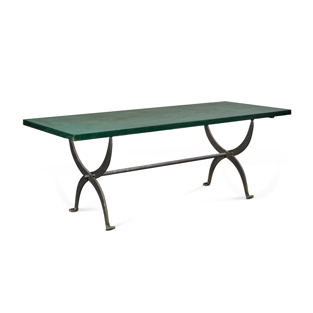 Pietra verde e ferro battuto, il piano rettangolare, le gambe arcuate unite da traversa centrale.