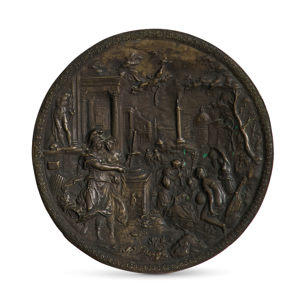 Bronzo a patina scura, fusione a cera persa raffigurante Atena sul Parnaso o scena delle Arti.