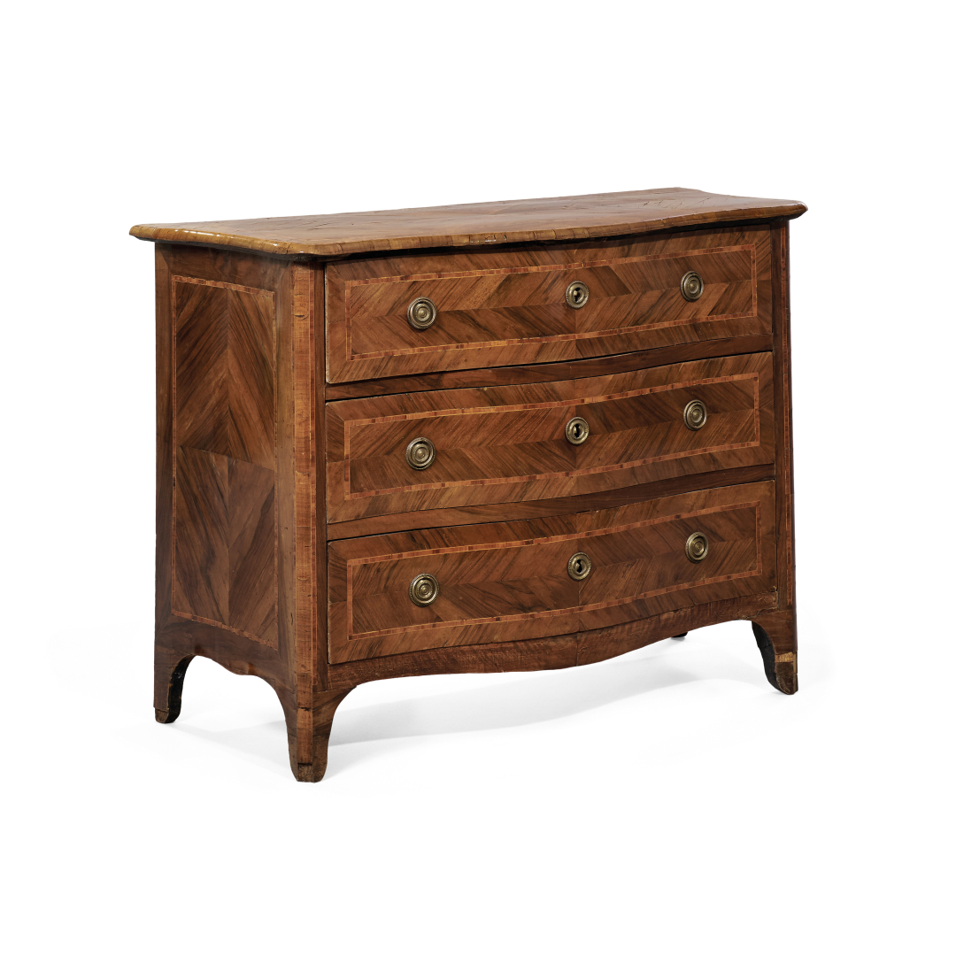 Noce, con intarsi a filetti, sagomata a tre cassetti.