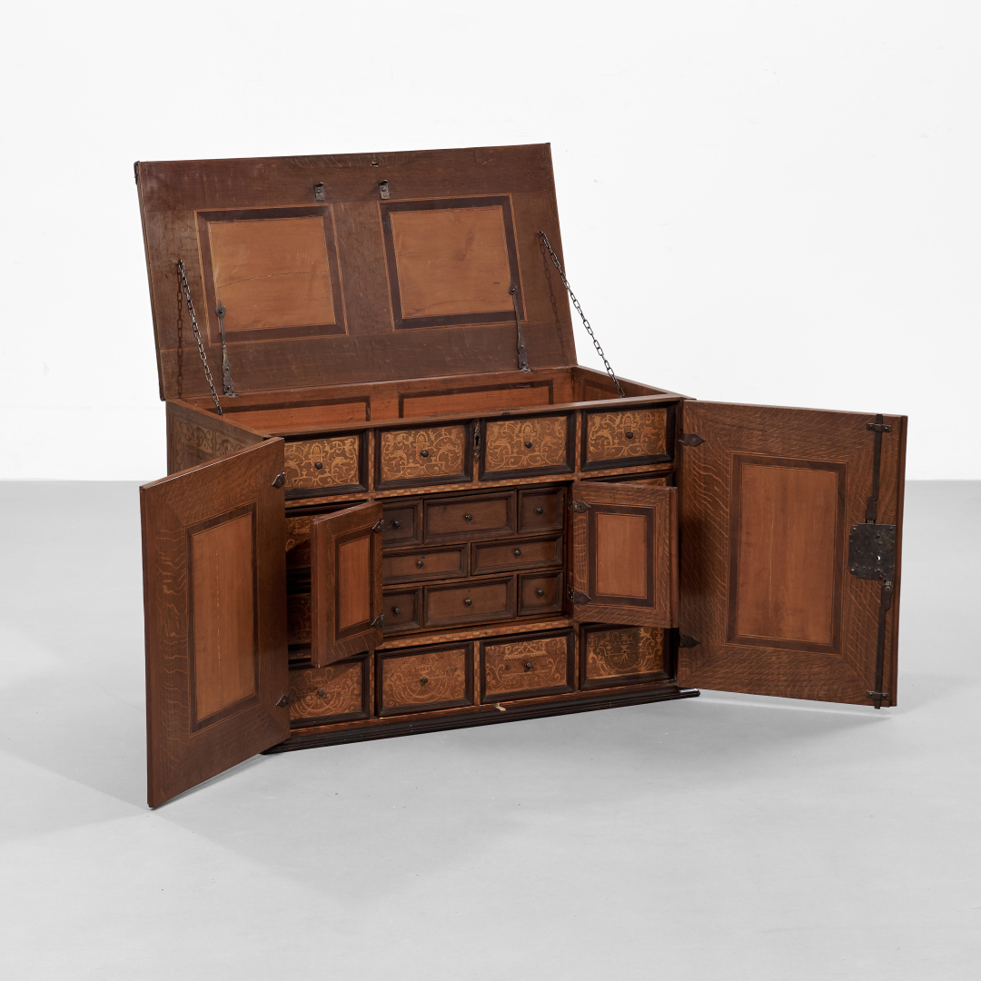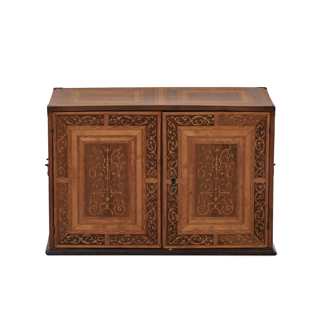 Legno intarsiato in essenze varie e parzialmente ebanizzato, a doppia anta, all'interno cassetti e segreto.