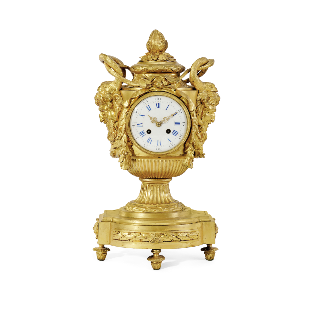 Cassa in bronzo a forma di urna con prese a serpenti intrecciati e mascheroni a forma di fauno, basata su un modello del bronzista Robert Osmond. Quadrante in smalto bianco con numeri romani, movimento con scappamento ad ancora, sospensione a lamella, suoneria delle ore e mezze ore al passaggio su campanello.