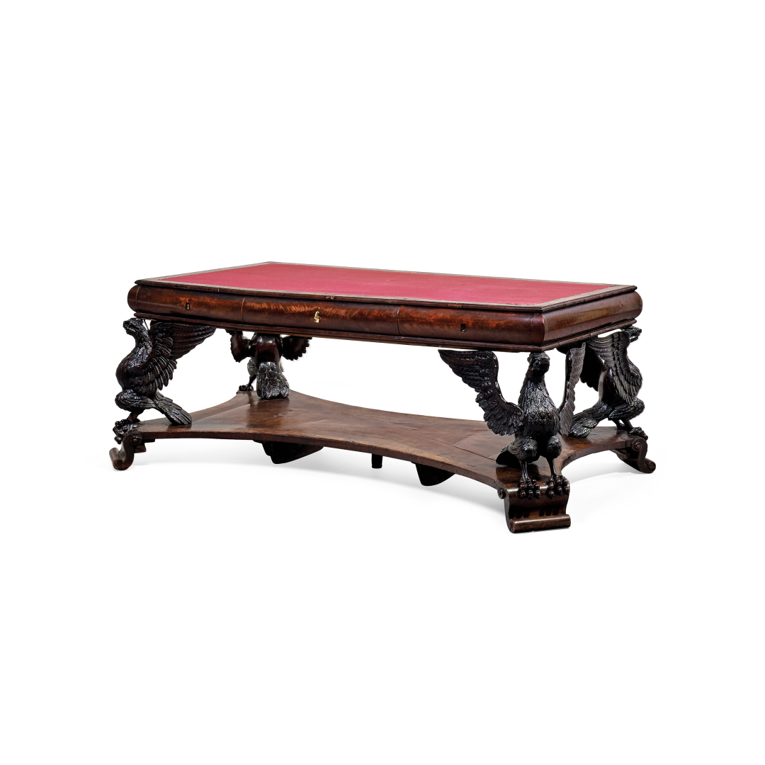 Mogano e legno ebanizzato, il piano rivestito in panno rosso e cassetti sulla fascia, sostenuto da basi scolpite con figure di aquile e su piedi a ricciolo.