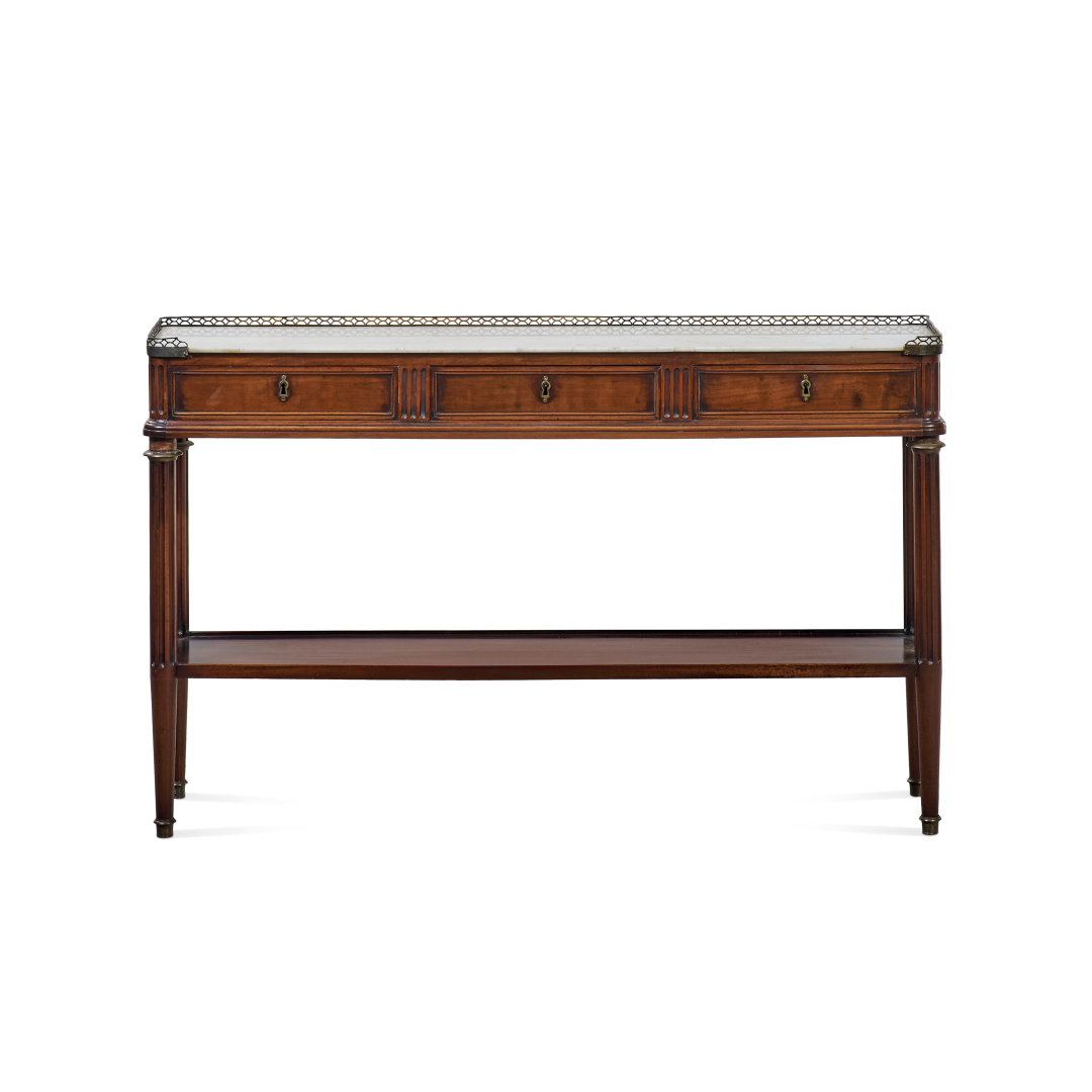 Mogano, rettangolare, il piano in marmo con galleria traforata in metallo dorato, tre cassetti sul fronte e gambe scanalate riunite da ripiano inferiore.