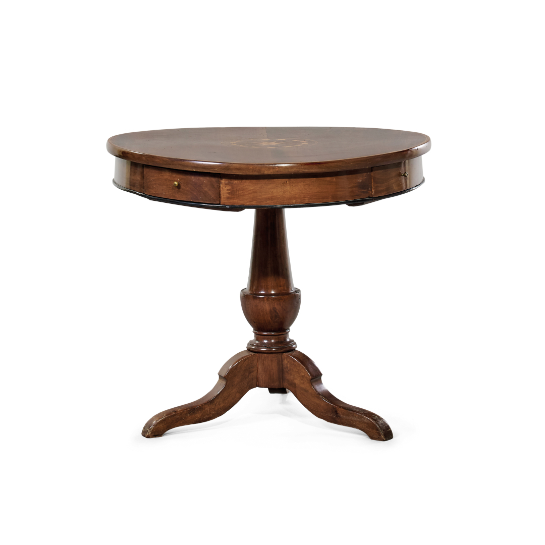 Noce, piano circolare con fascia contenente cassetti, sostegno centrale tornito, su base tripode sagomata.