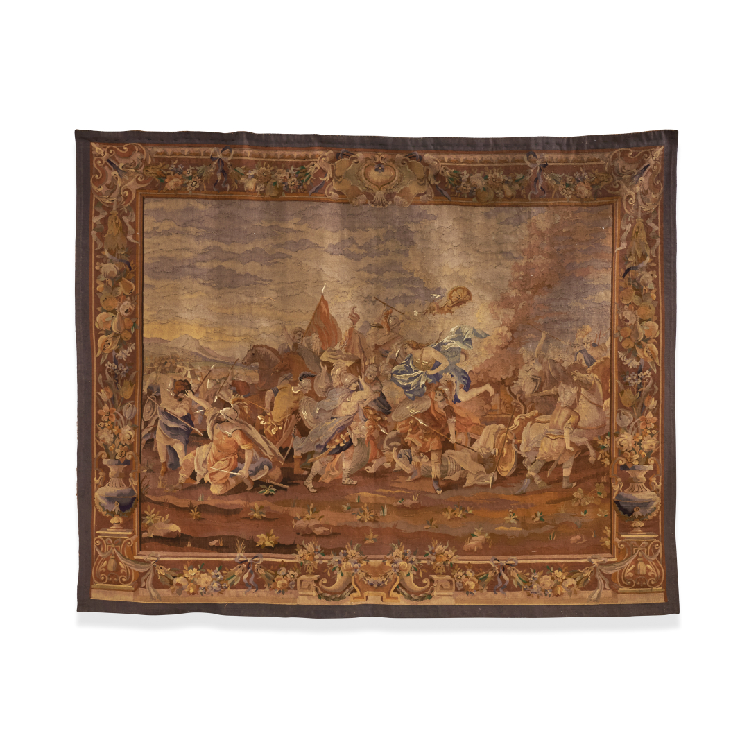 Raffigurante scena di battaglia con figure armate e cavalli, entro ricca bordura floreale con motivi ornamentali.