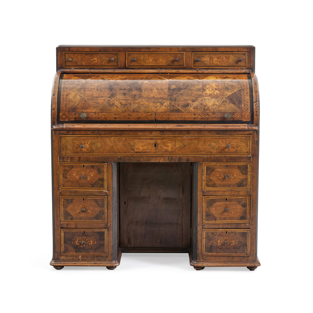 Impiallacciata in noce e radica di noce, con intarsi in bosso ed essenze varie a filetti, motivi geometrici, fitomorfi e grottesche, sul fronte un grande cassetto, nove piccoli cassetti, lo scrittoio celato da una copertura a rullo presenta un piano scorrevole rivestito in tessuto verde e sei piccoli cassetti, sui lati, riccamente decorati, due piccoli sportelli.