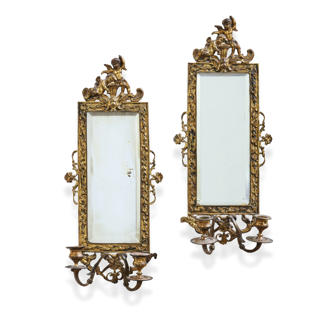 Legno intagliato e dorato, tolla dorata e specchi, rettangolari, a due luci, con decoro di volute fogliacee, cimate da una coppia di putti poggianti su un fermaglio centrato da una civetta.