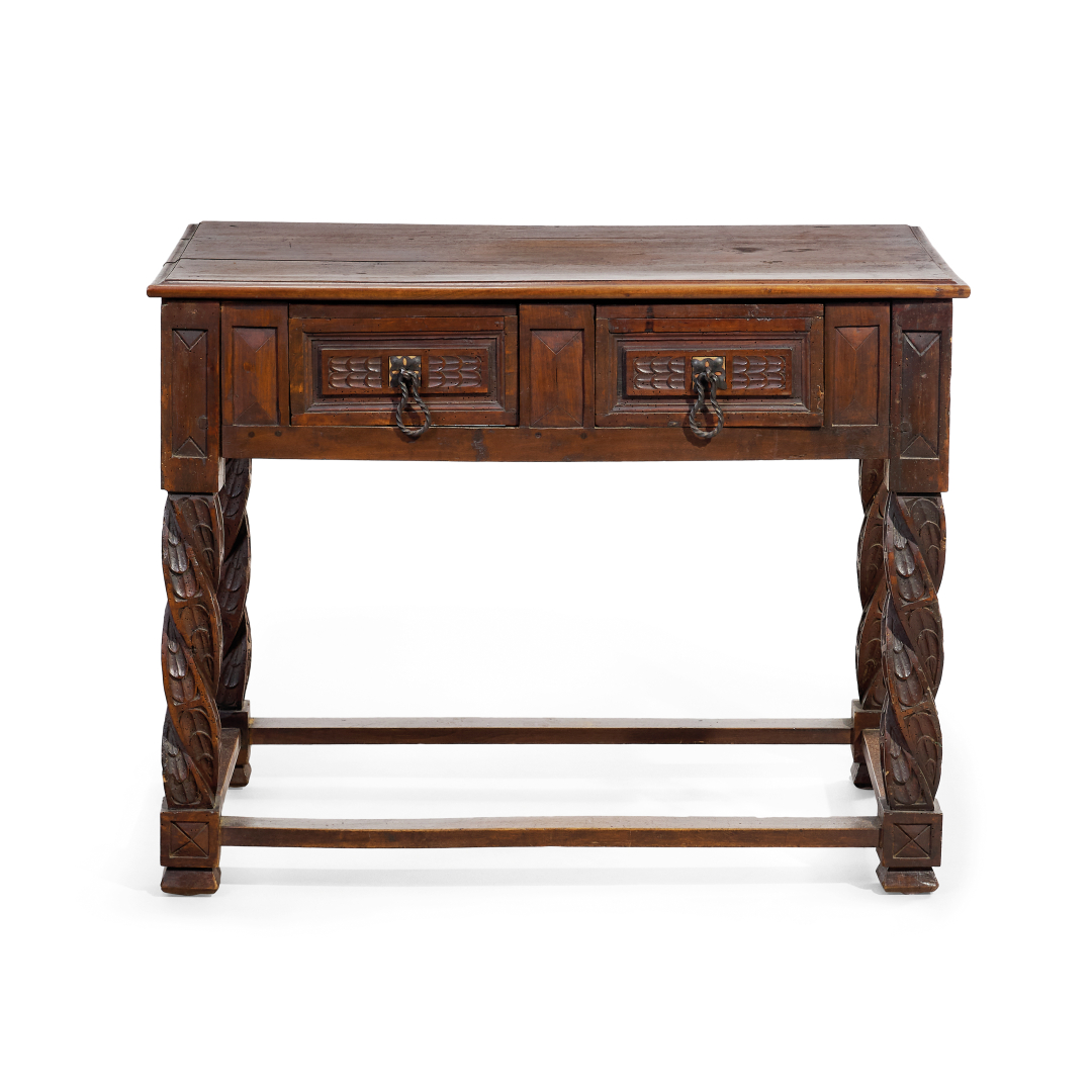 Noce, a due cassetti scolpiti a motivi fitomorfi, su quattro colonne tortili unite da traverse.