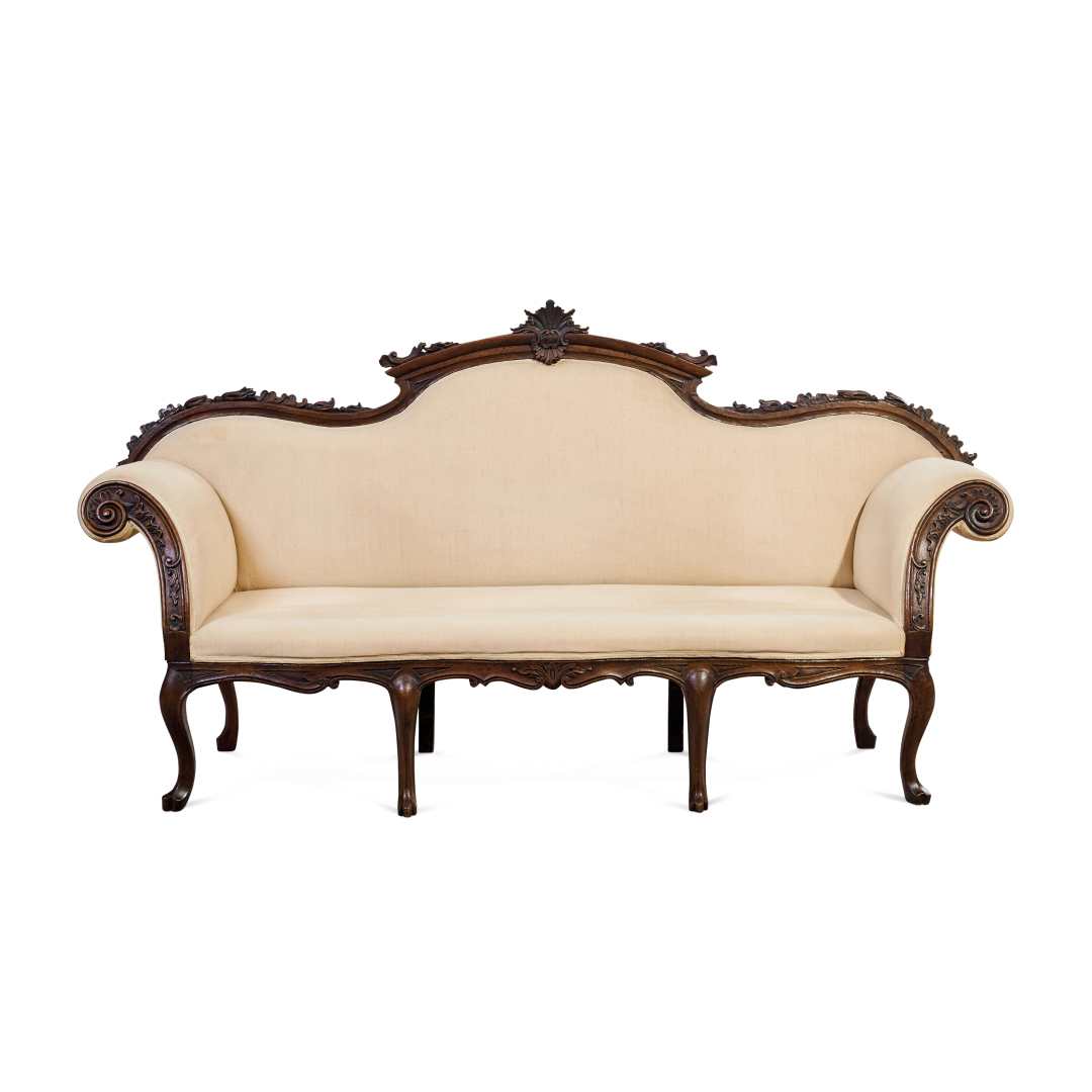 Noce scolpito, sagomato con ampi braccioli e ricciolo e schienale con decori fogliacei centrato da una conchiglia, rivestimento in tessuto avorio.