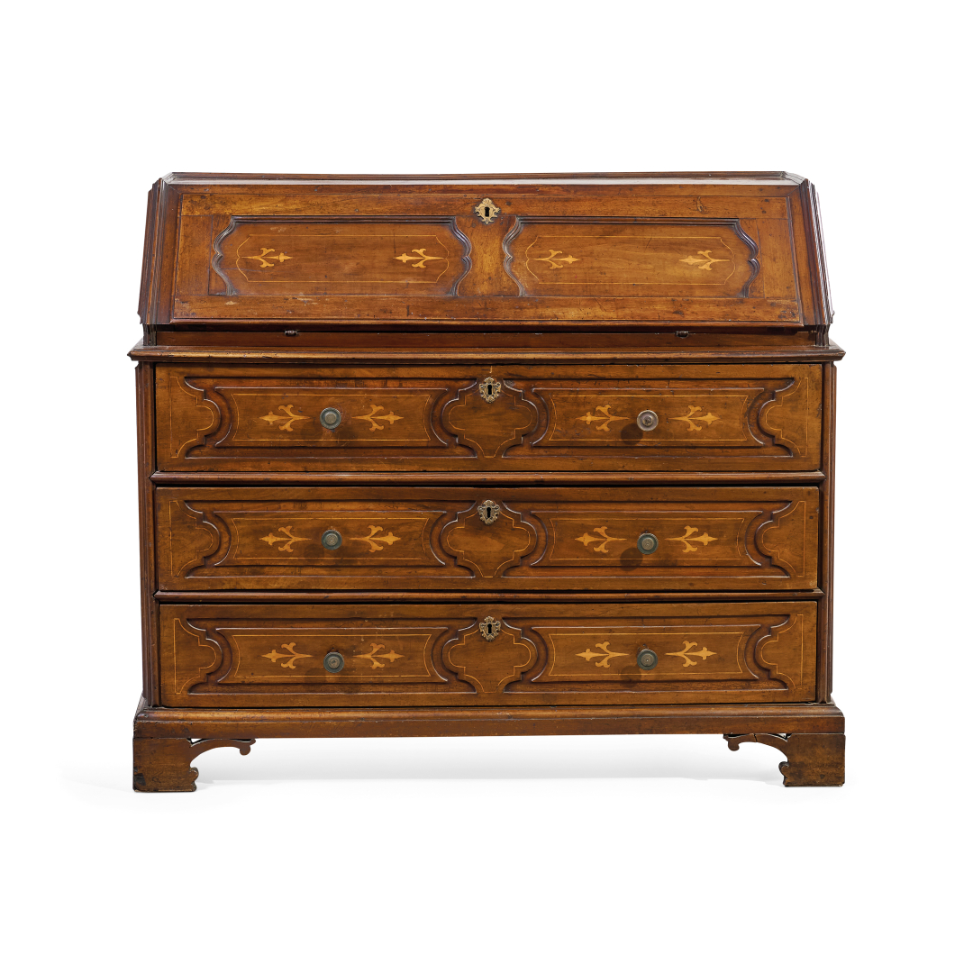 Noce, intarsiato in essenze varie e legno ebanizzato, a tre cassetti e una ribalta, all'interno della calatoia cassetti e vani, su piedi a mensola.