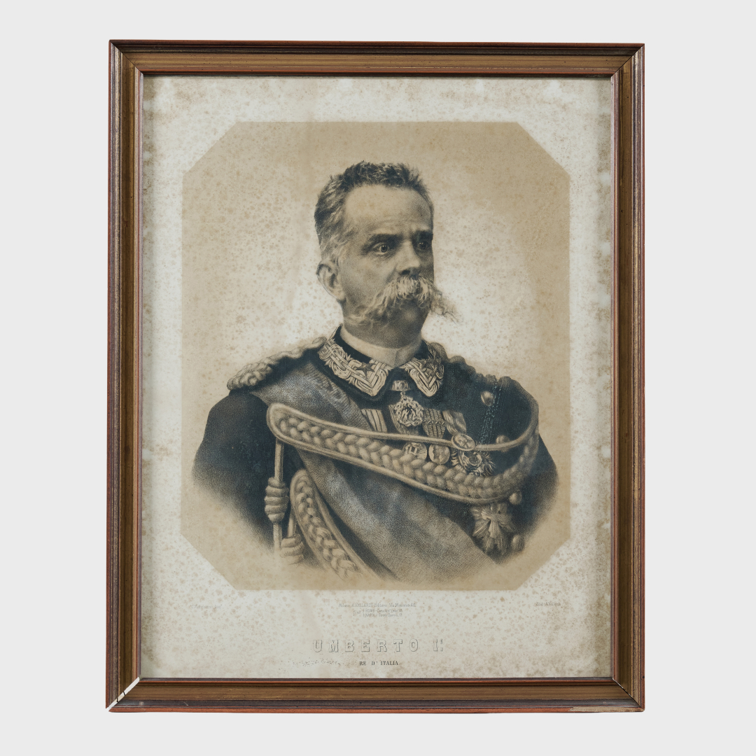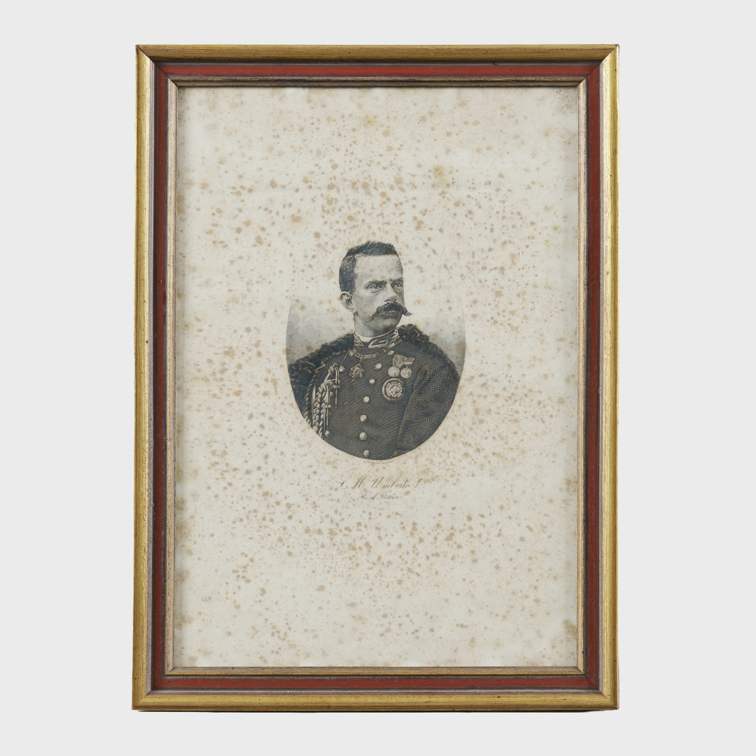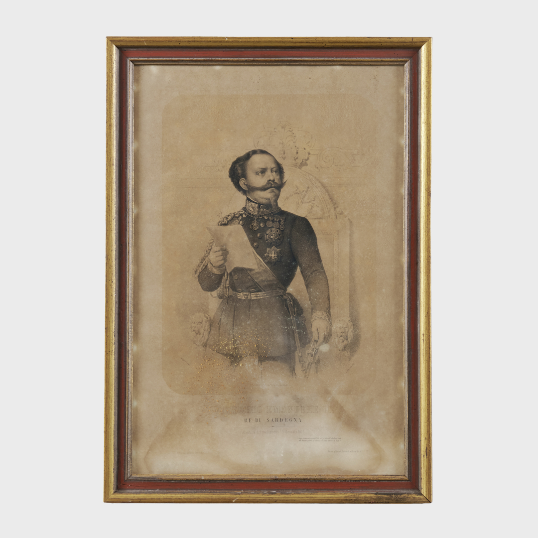 Sei stampe in cornice raffiguranti re di Sardegna e d’Italia, tra cui Carlo Felice, Umberto I, Vittorio Emanuele II e Maria José.