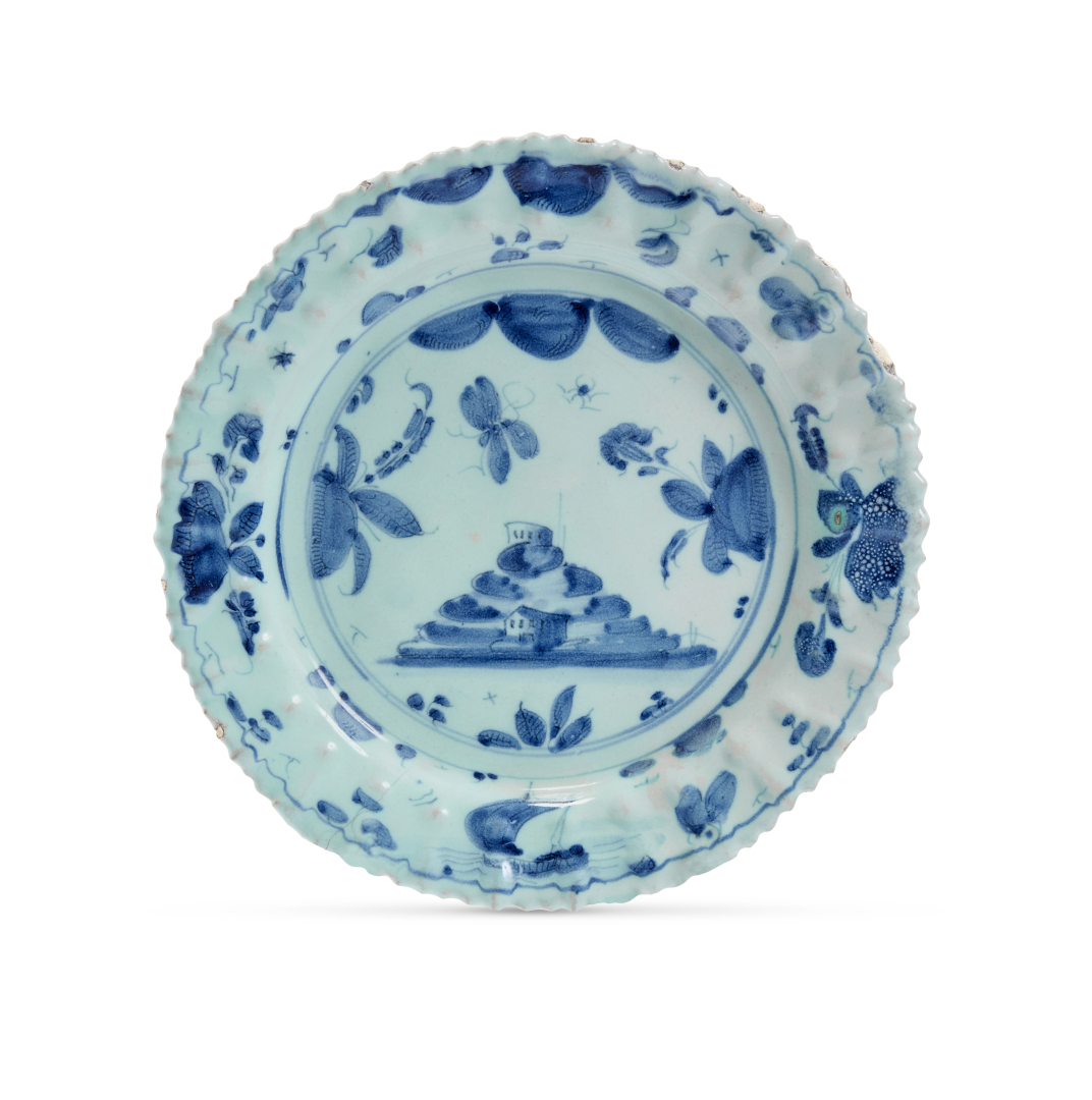 Maiolica, decoro a tappezzeria in monocromia turchina, marca Stemma di Savona.