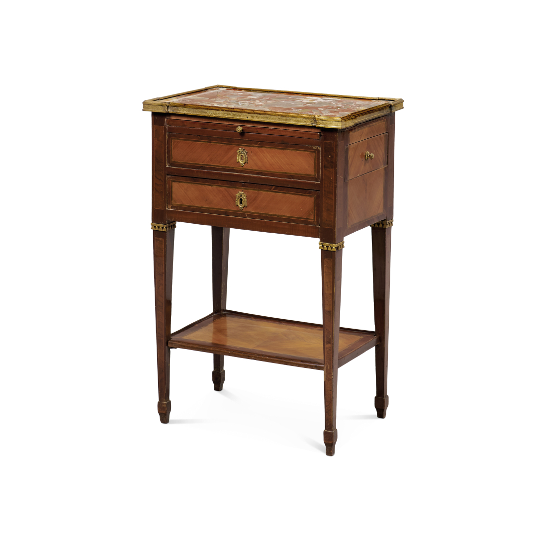 Ciliegio e mogano, il piano in marmo con galleria a giorno in ottone, due cassetti sul fronte, un cassetto retrattile e un ripiano inferiore, su gambe rastremate.
