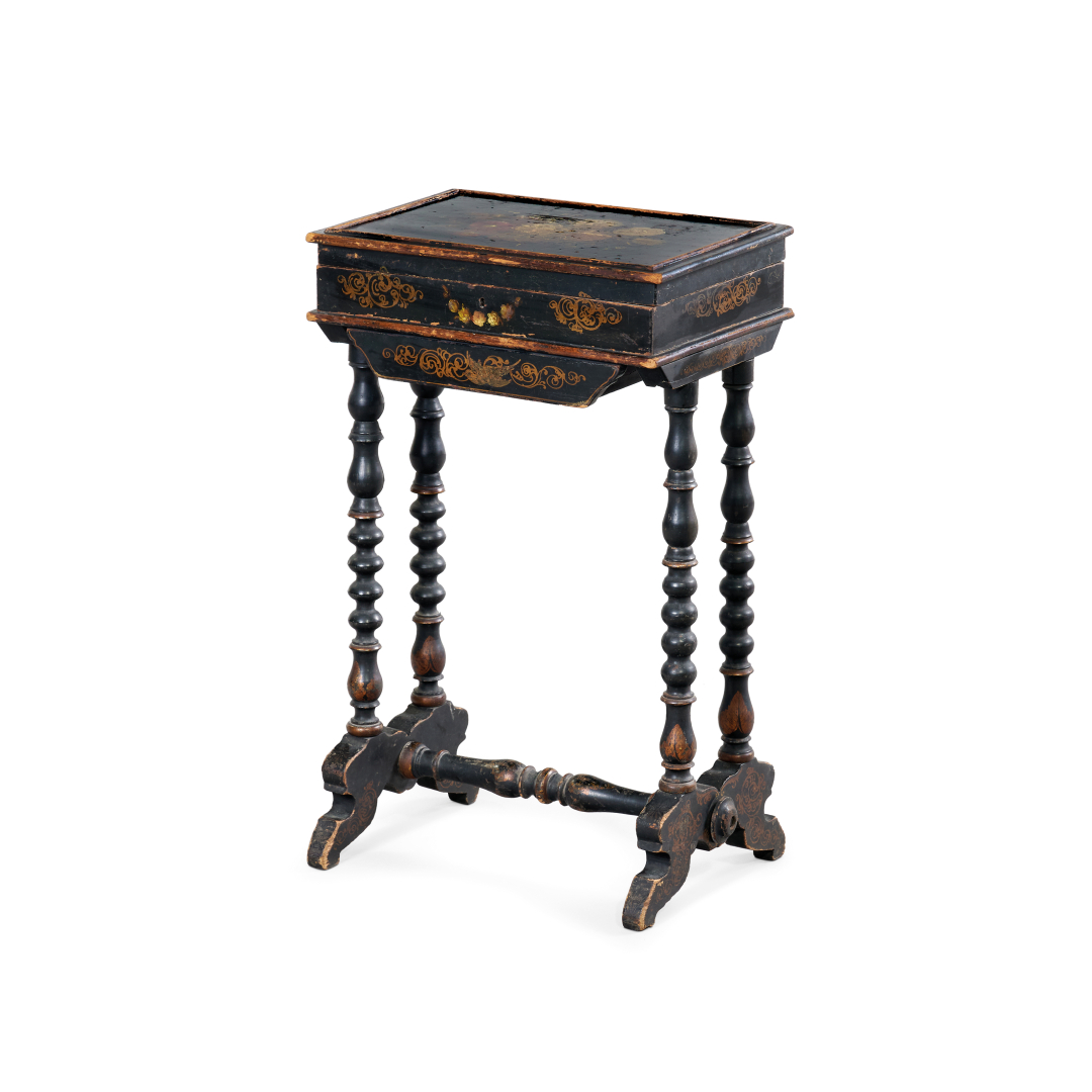 Legno di pioppo ebanizzato e dipinto con decori floreali e volute, un cassetto frontale, su gambe a balaustro unite da traversa centrale.