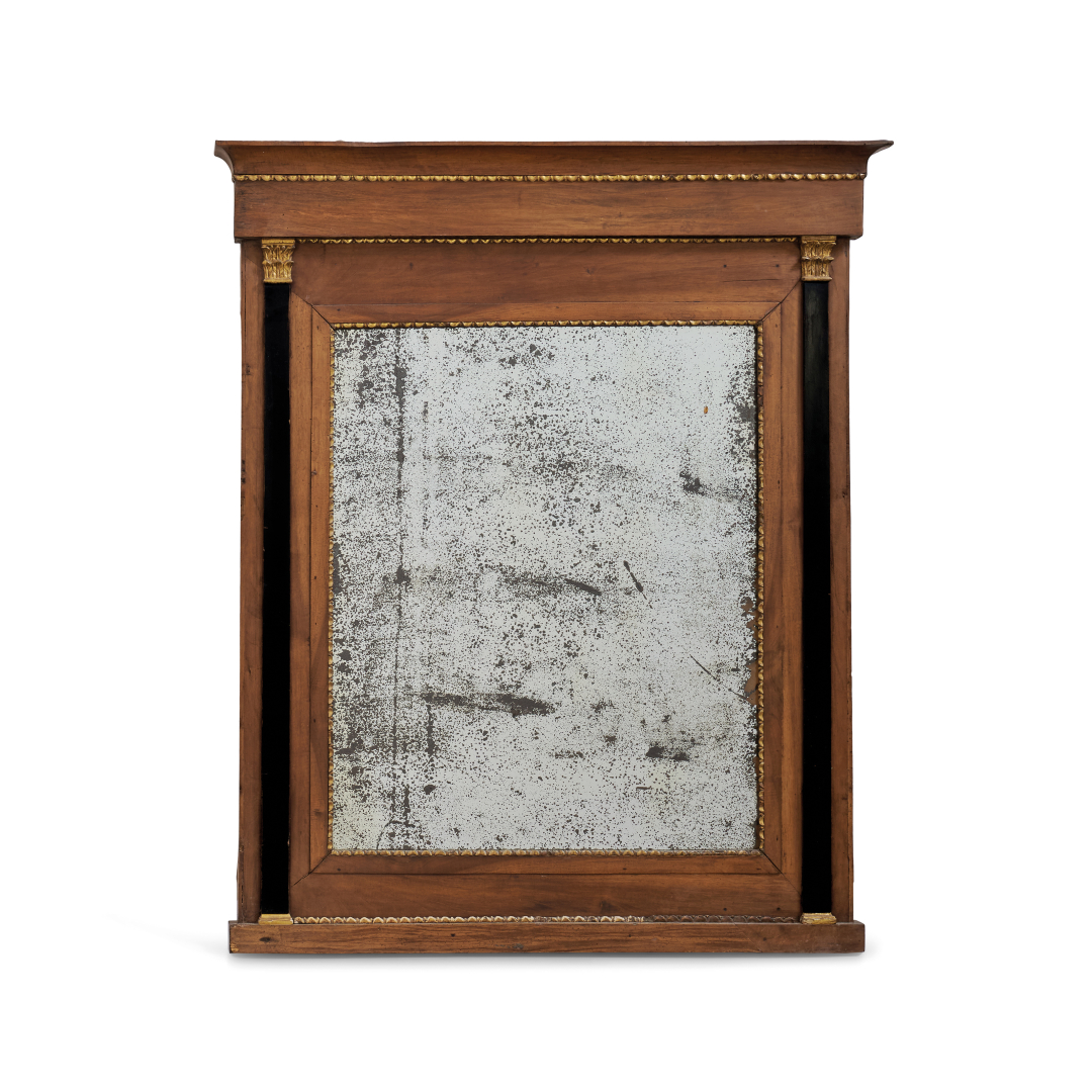 Noce e legno ebanizzato, decoro intagliato con motivo a ovoli e perline dorate, lo specchio coevo.