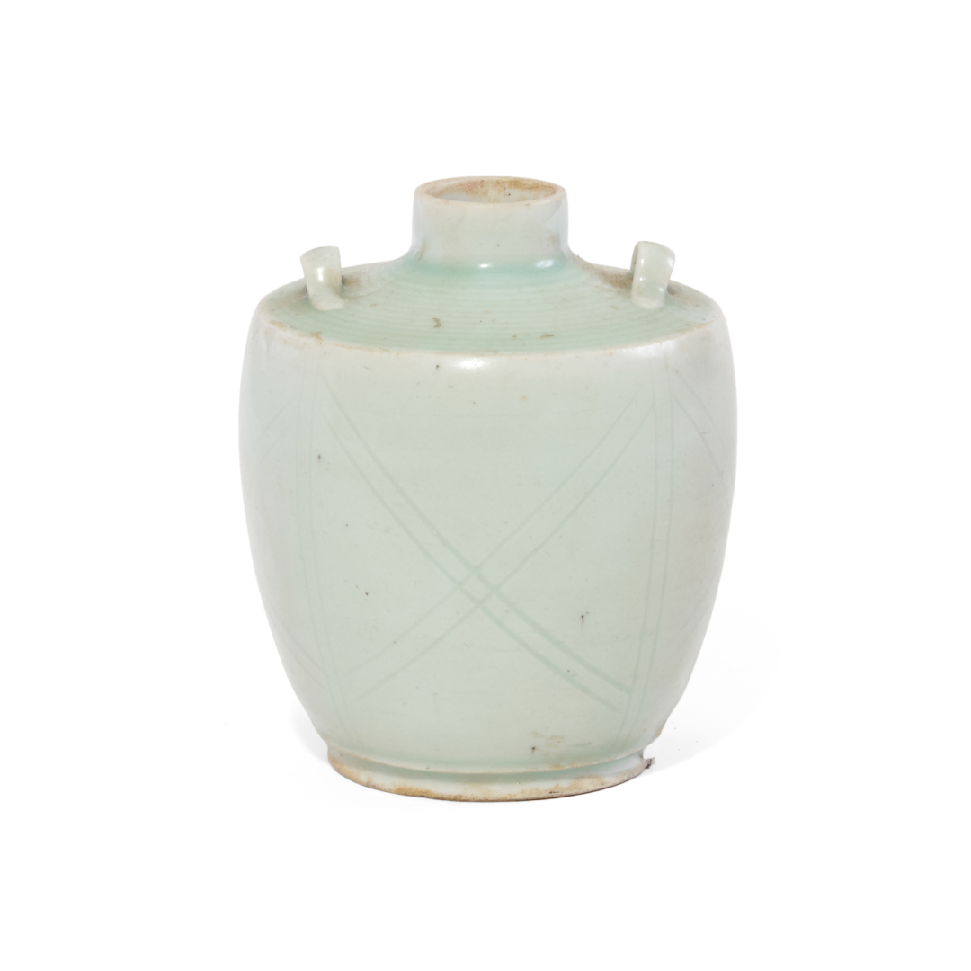 Porcellana con invetriatura qingbai, sul corpo leggere incisioni con motivo geometrico, sulla spalla piccole prese semicircolari.