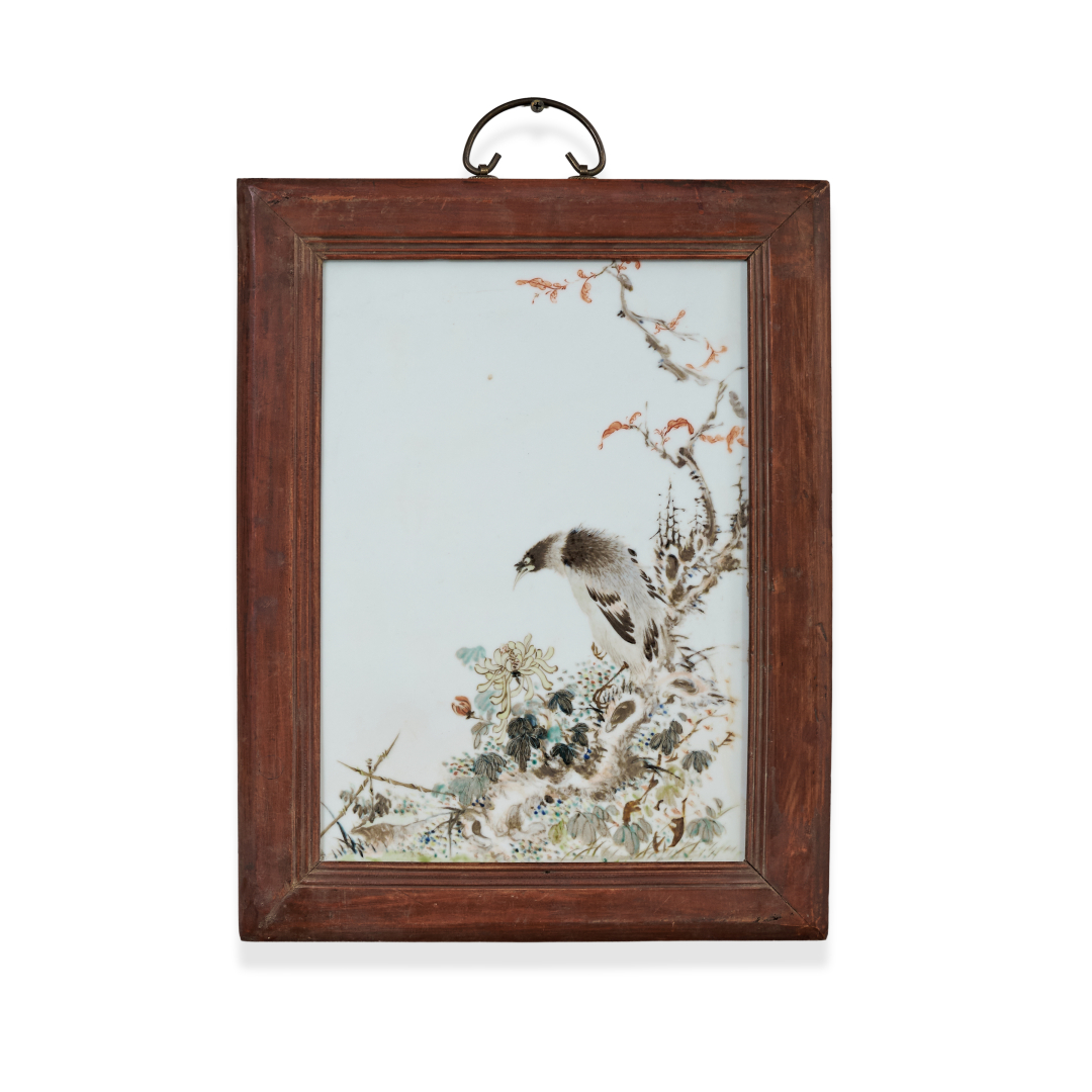 Porcellana dipinta a smalti policromi, decoro composto da un uccello posato su un ramo e dei fiori, cornice in legno.
