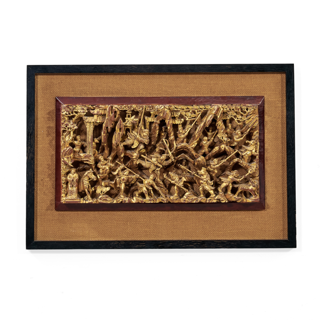 Legno dorato, scena di battaglia con una moltitudine di personaggi tra architetture, rocce e alberi, entro cornice in legno.