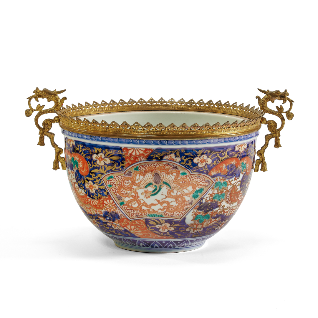 Porcellana di tipo Imari, dipinta a smalti policromi e oro con arabeschi floreali e animali mitologici, l'orlo della bocca con montatura in bronzo di manifattura europea sulla quale si innestano due prese a forma di drago.