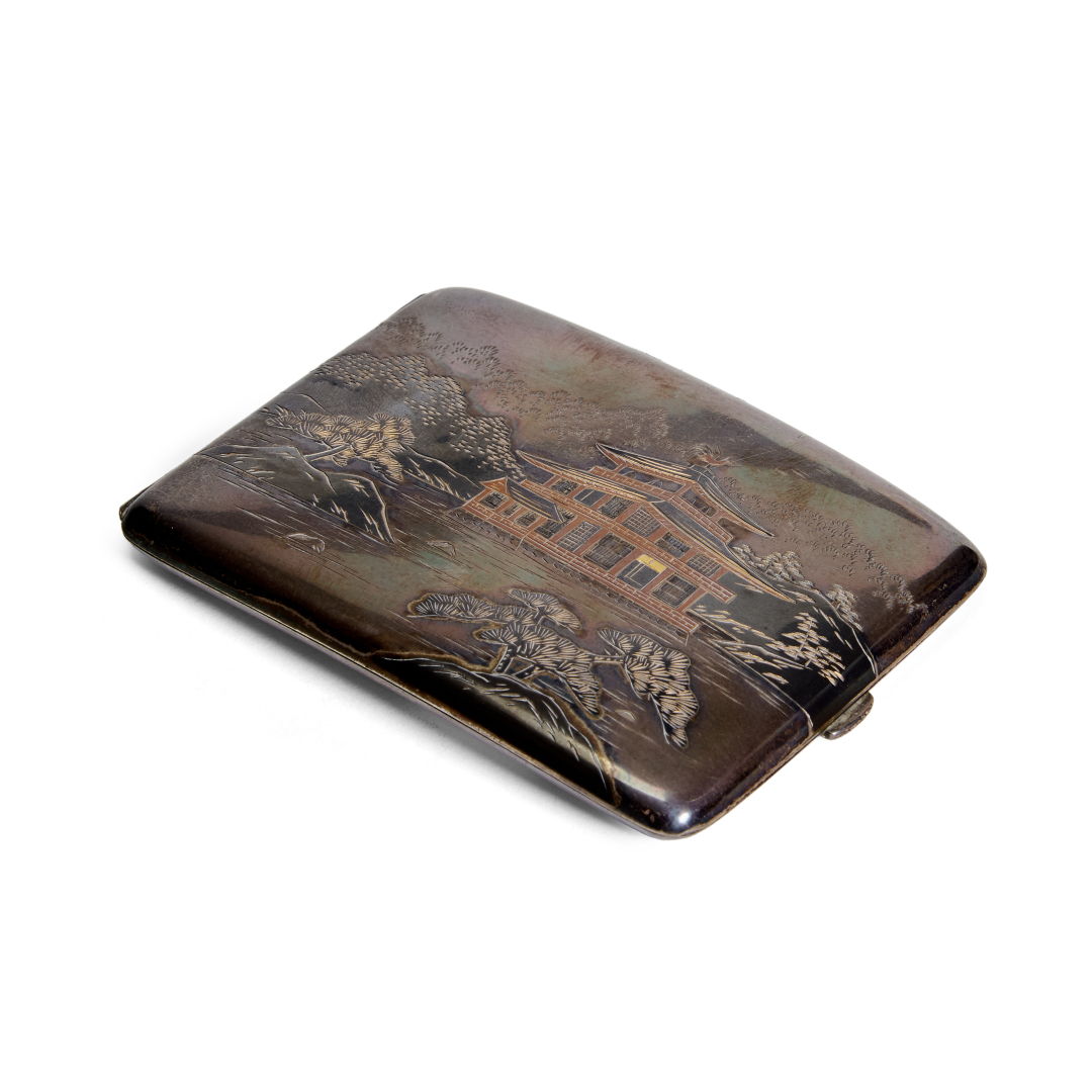 Metallo argentato con inserti policromi e oro, la superficie a vista con una veduta del Padiglione d'Oro di Kyoto, il retro con uno scorcio di paesaggio lacustre, l'interno ancora con una veduta del Padiglione d'Oro, firma sul retro.