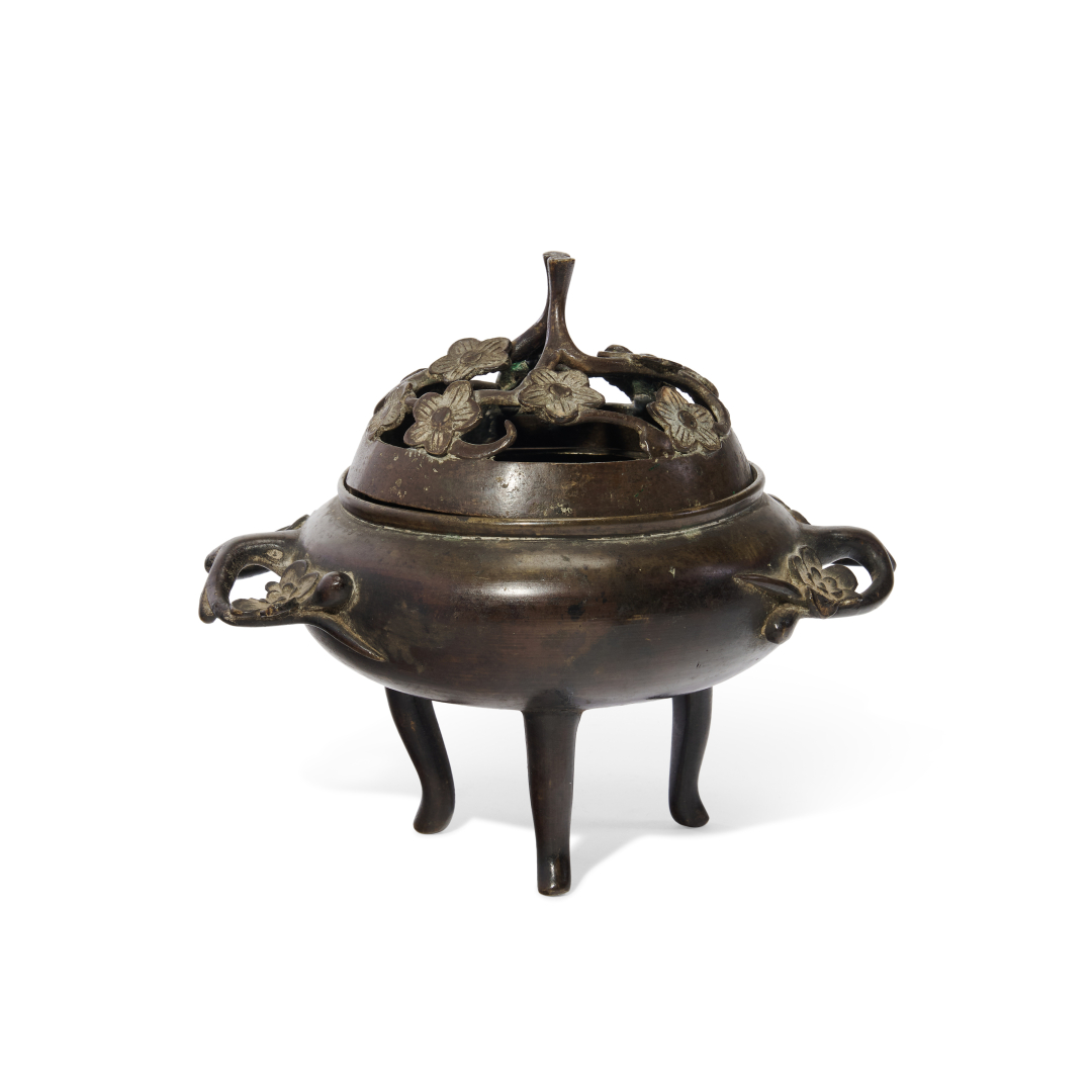 Bronzo, sostenuto da tre piedi, le anse e il coperchio modellati come rami fioriti di ciliegio.