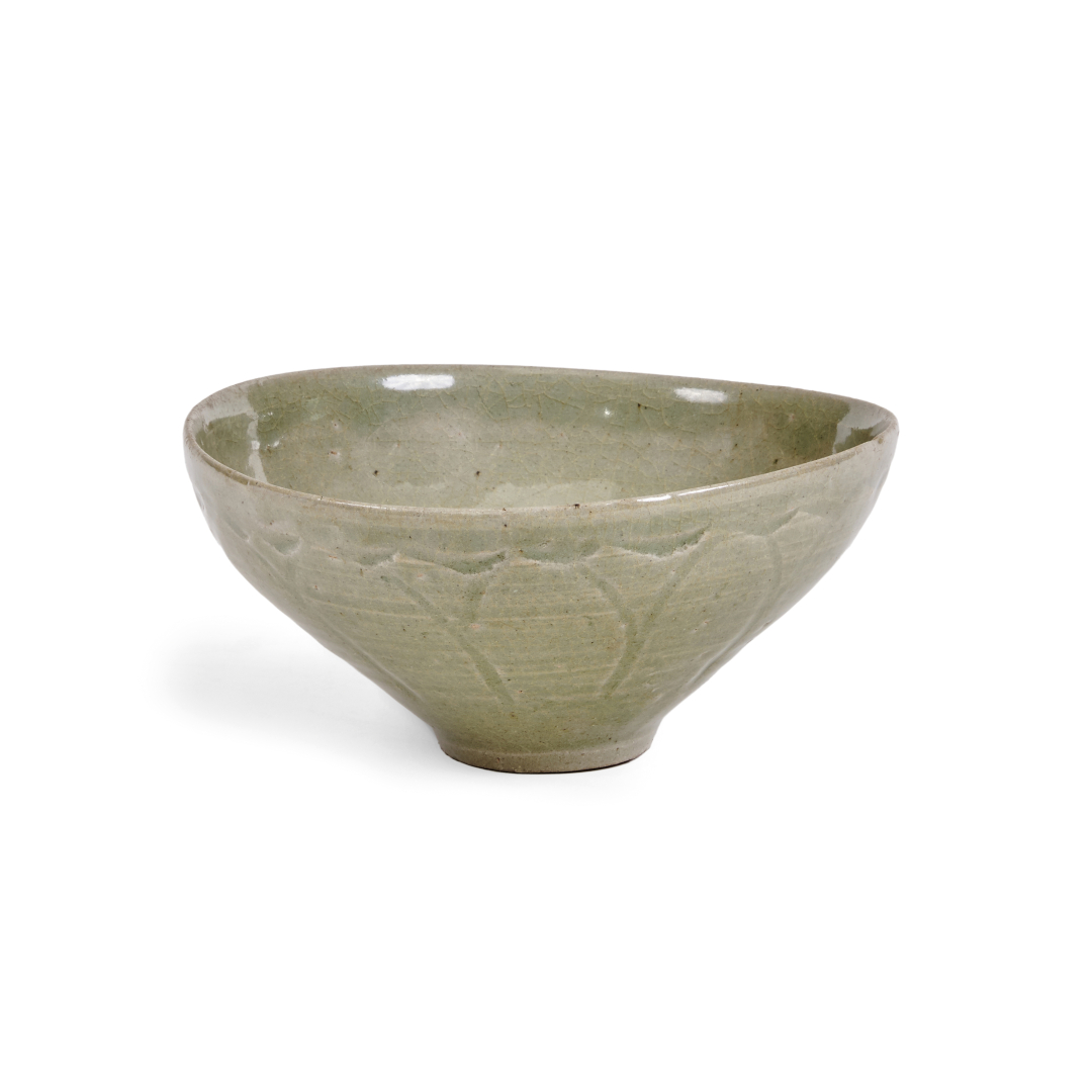 Ceramica con invetriatura céladon, l'esterno con foglie stilizzate a leggero rilievo.