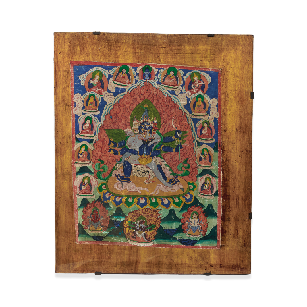 Colori su tessuto, raffigura al centro Vajrakilaya nella sua manifestazione Heruka, con tre teste, sei braccia e quattro gambe, mentre abbraccia la sua dakini, circondata da divinità e lama.