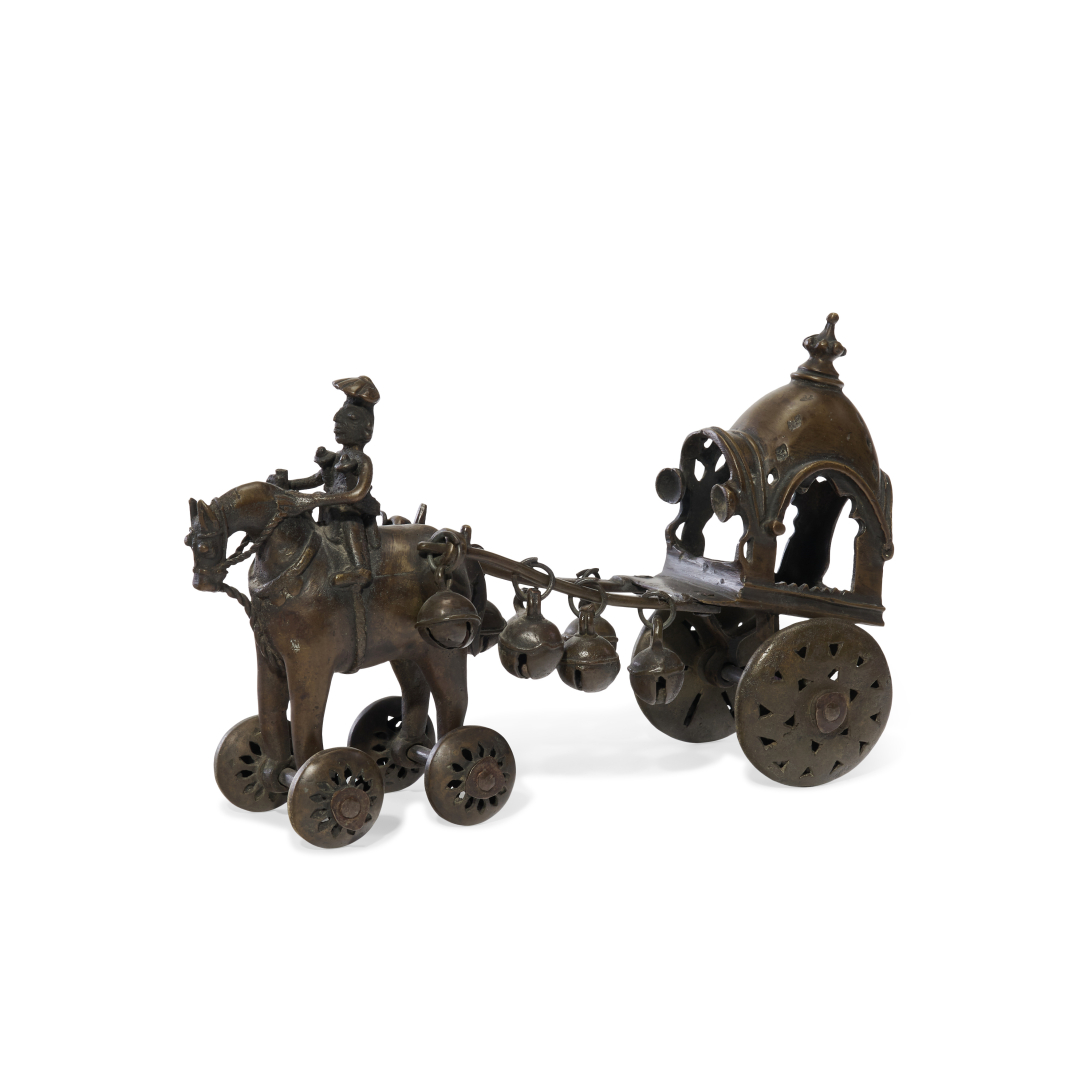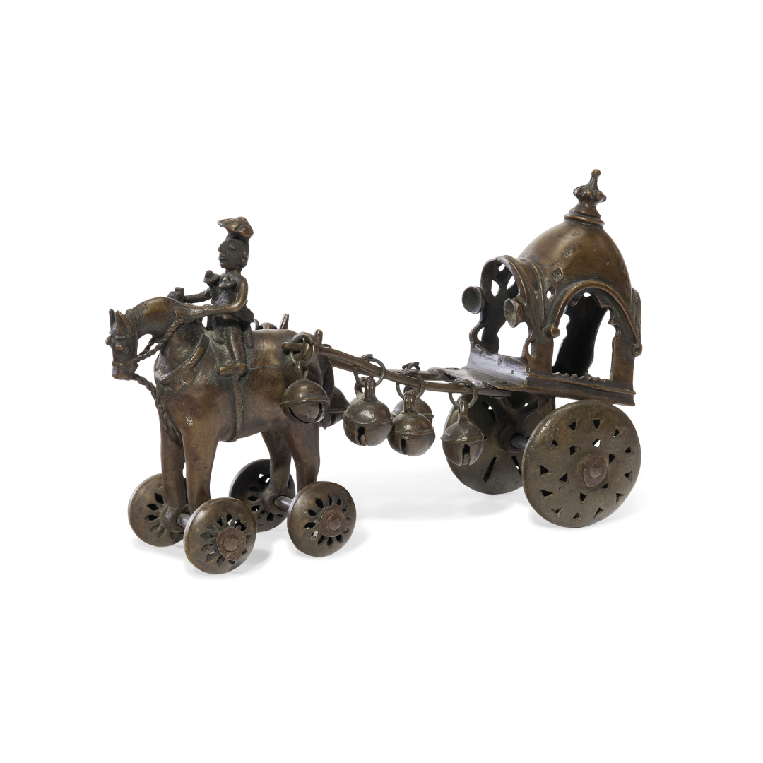 Lega di rame, si tratta di un giocattolo raffigurante un carretto trainato da un cavallo con cocchiere, il tutto posato su ruote, sei sonagli sulle fasce di raccordo.