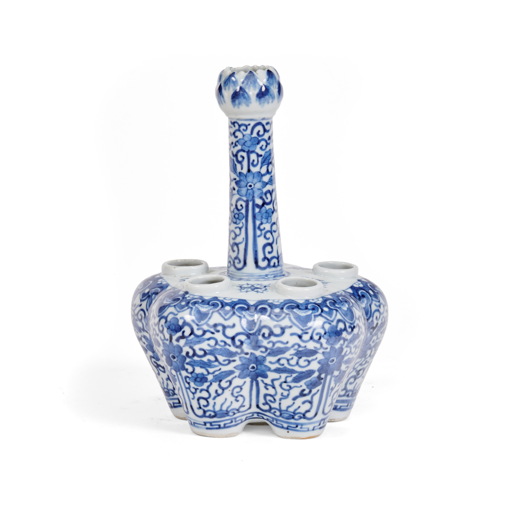 Porcellana 'bianco e blu', decoro floreale, la bocca modellata come bocciolo.