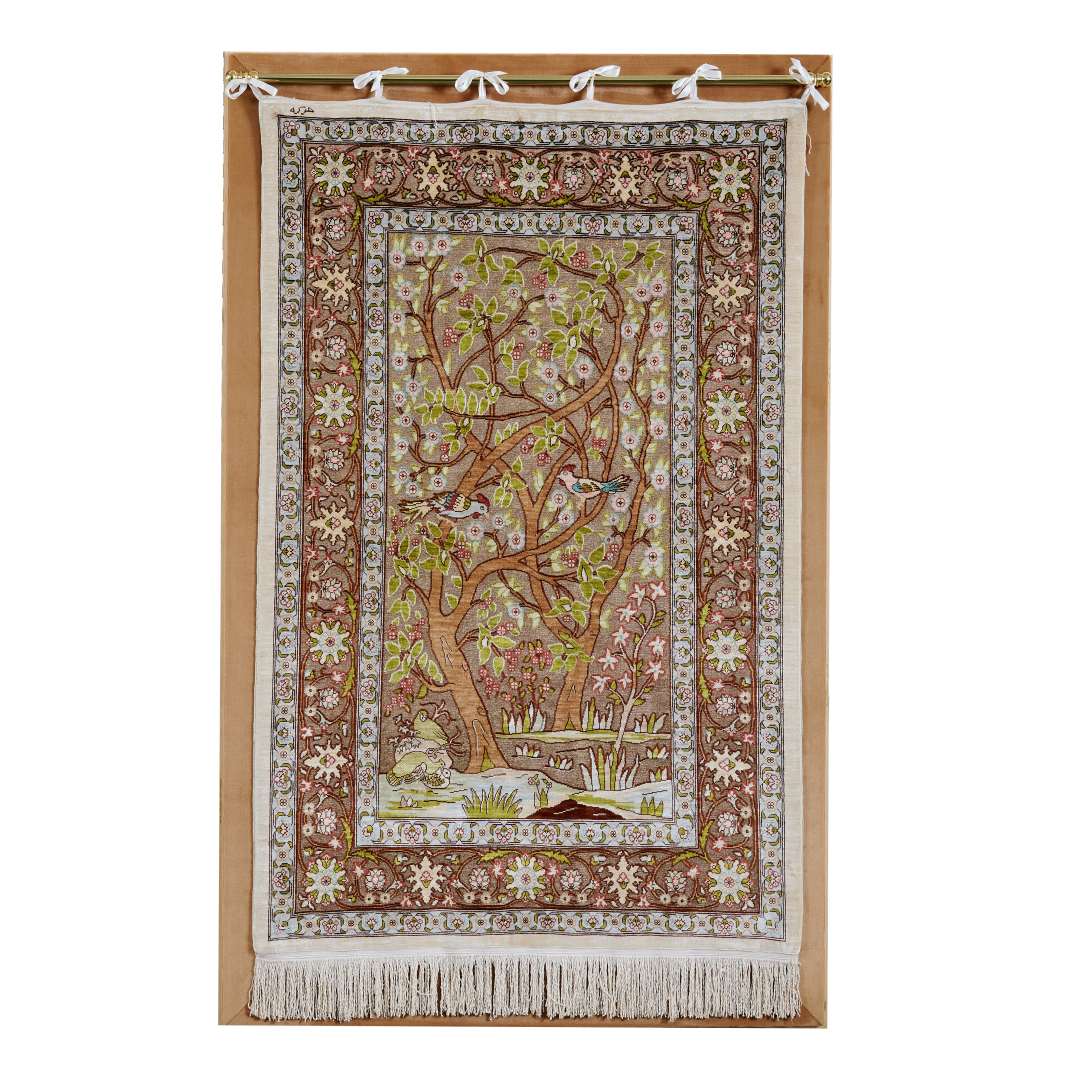 Tessuto, al centro un albero fiorito con uccelli, racchiuso entro bordure floreali.