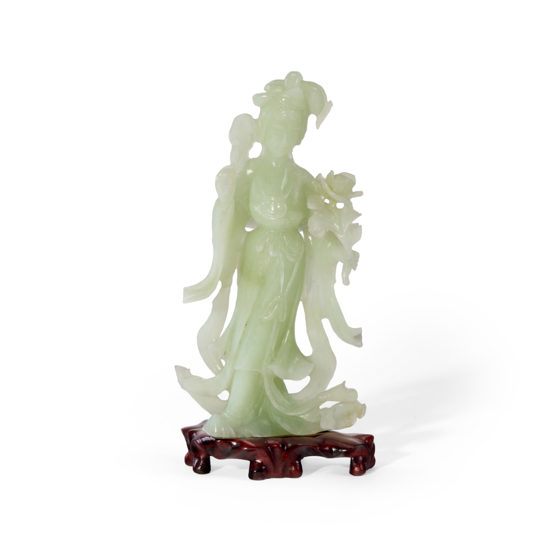 Pietra verde chiaro, la figura stante su base in legno.