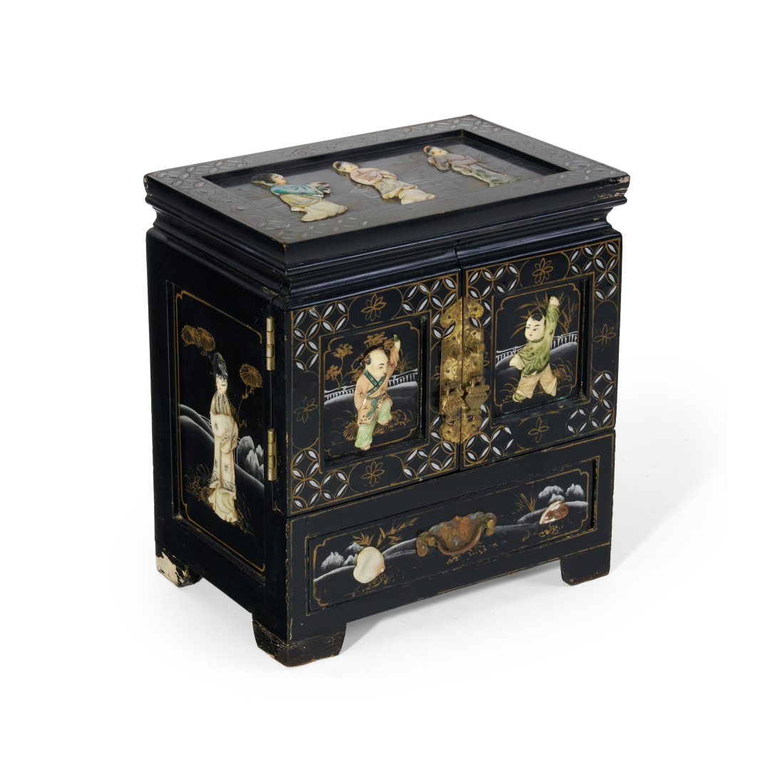 Legno laccato con intarsi in pietre dure e madreperla, gli sportelli più grandi sul davanti e il piano superiore con decoro di figure, all'interno cassetti.