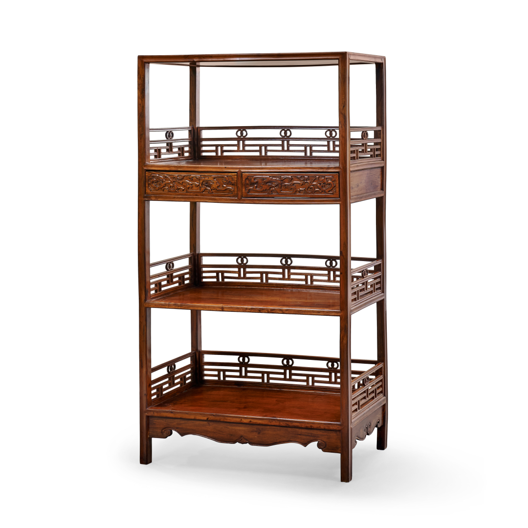 Legno, a tre ripiani, quello superiore con due cassetti con il fronte finemente intagliato a draghi stilizzati a rilievo, le spalliere laterali e posteriori intagliate a giorno con motivi geometrici.