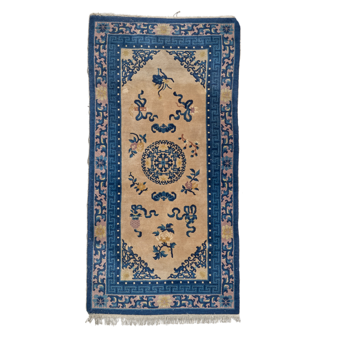 Decoro policromo a motivi floreali, pipistrelli e oggetti al centro, entro due bordure, una geometrica e la  più esterna floreale, su fondo ocra.