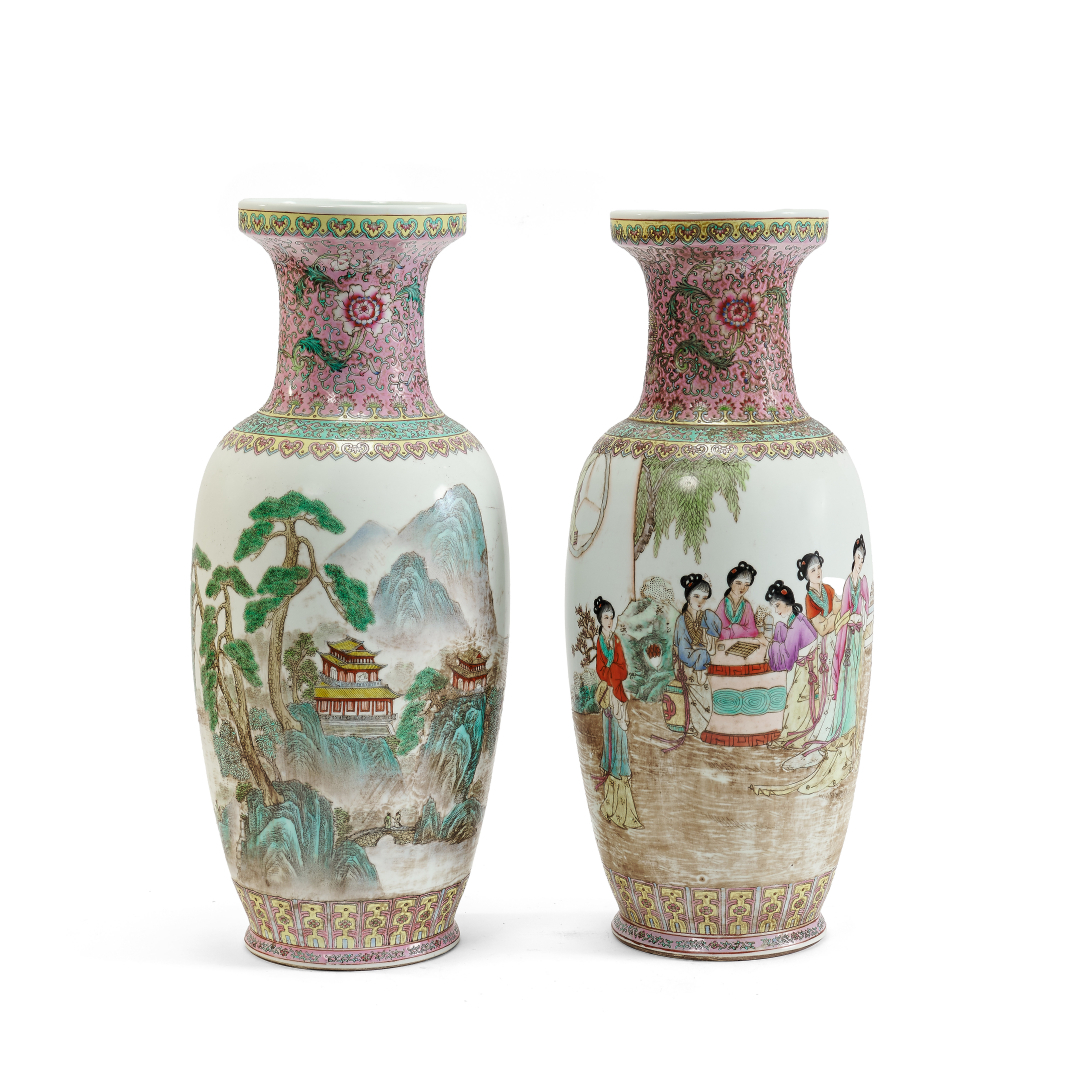 Porcellana dipinta a smalti policromi, il primo raffigurante un decoro con figure femminili e paesaggi, il secondo presenta un fine decoro di paesaggio lacustre con padiglioni e figure, il collo di ambedue con motivi floreali; entrambi presentano un marchio al centro della base.