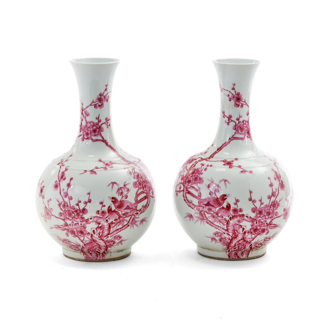 Porcellana dipinta in monocromia a smalto rosa-viola con un raffinato decoro di uccelli e rami fioriti, marchio apocrifo di Yongzxheng al centro della base di entrambi, su basi in legno.
