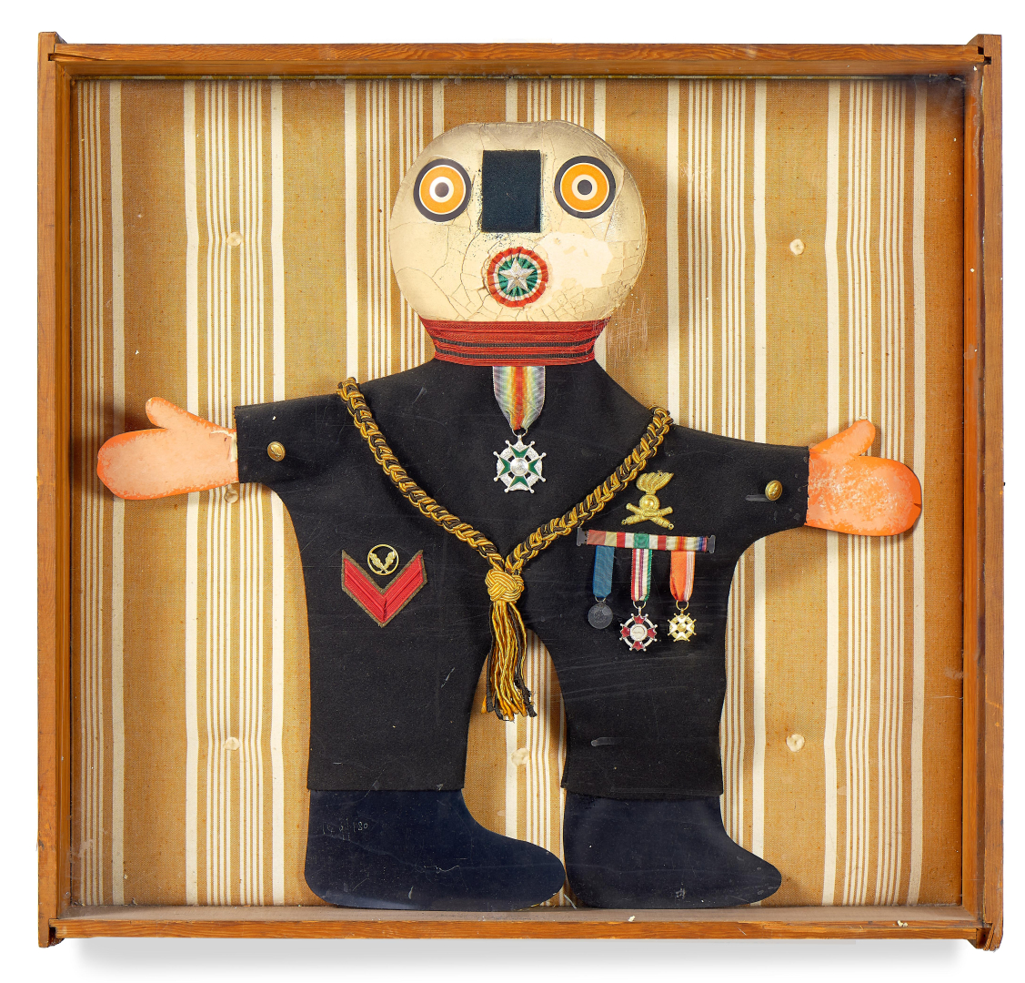 Stoffa, feltro, metallo, spugne, vinile e carta entro teca in legno, ed. 149/180.