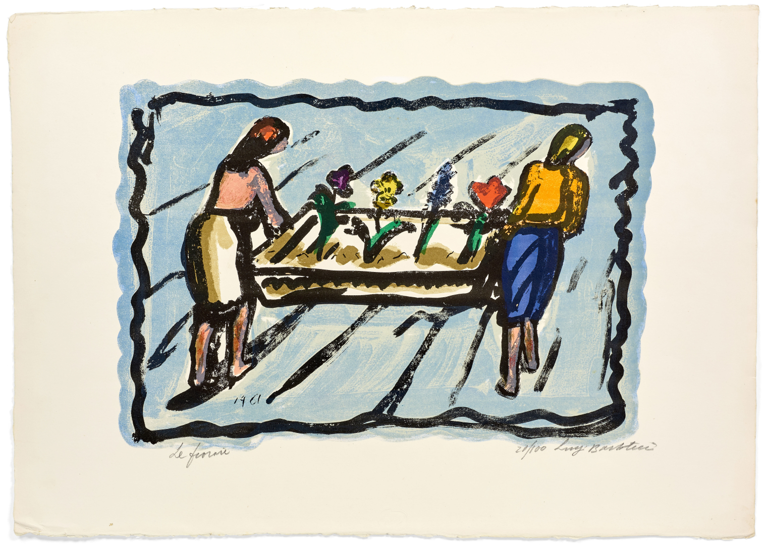Assieme: La fioraia, 1961, litografia a colori, ed. 20/100, 46,00 x 65,00 cm, firmato e numerato al recto in basso a destra, titolato a sinistra.