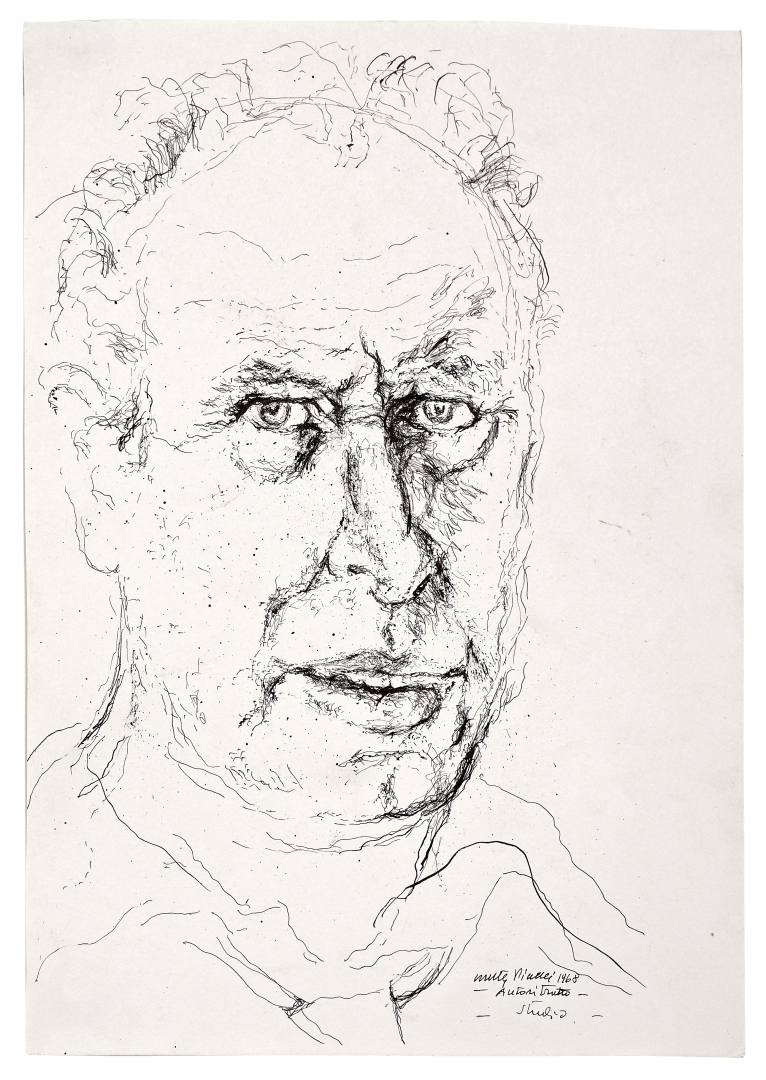 Assieme: Walter Piacesi, autoritratto 'studio', 1968, china su carta, 34,50 x 24,00 cm., firmato, datato e titolato al recto in basso a destra, al verso timbro Libreria Prandi, Reggio Emilia.