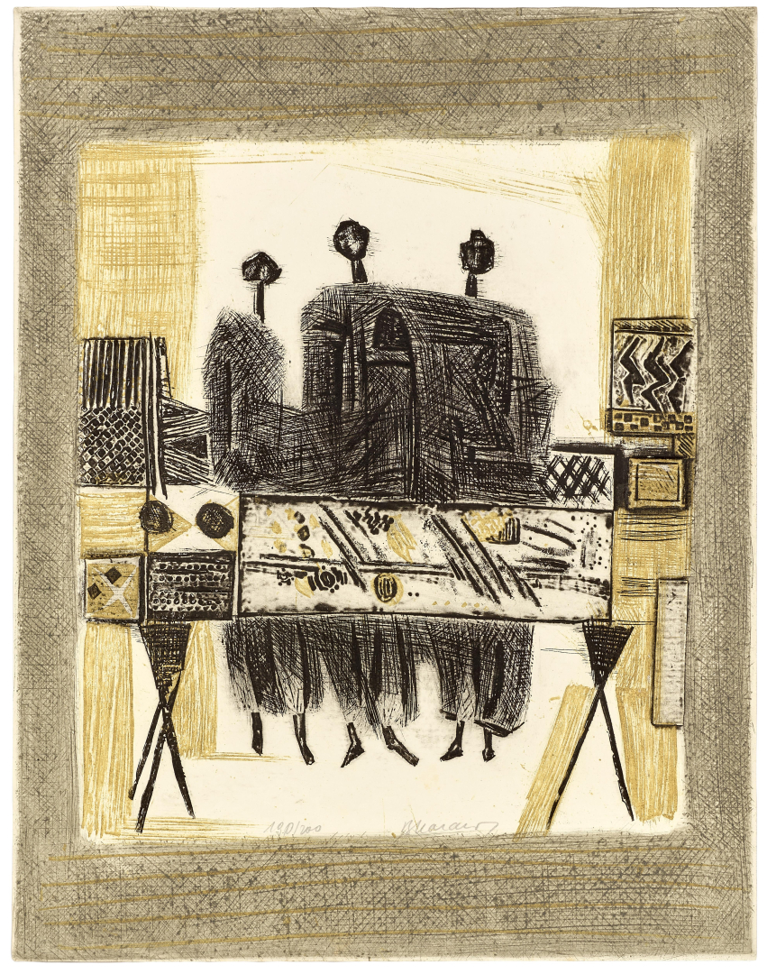 Assieme: Domenico Cantatore, senza titolo, 1962, acquaforte e acquatinta, ed.16/25, 50,00 x 70,00 cm. firmato e datato al recto in basso a destra, numerato a sinistra, al verso timbro V Biennale Ing. It. - Ass. Ing. Veneti, 1963.
