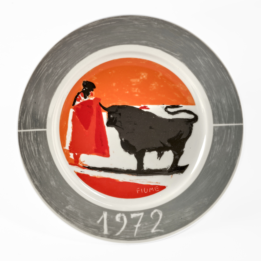 Assieme: Salvatore Fiume, Piatto dell'anno, 1972, ceramica serigrafata, ed. 135/500, 25,00 x 25,00 cm, firmato e datato al recto, firmato al verso.
