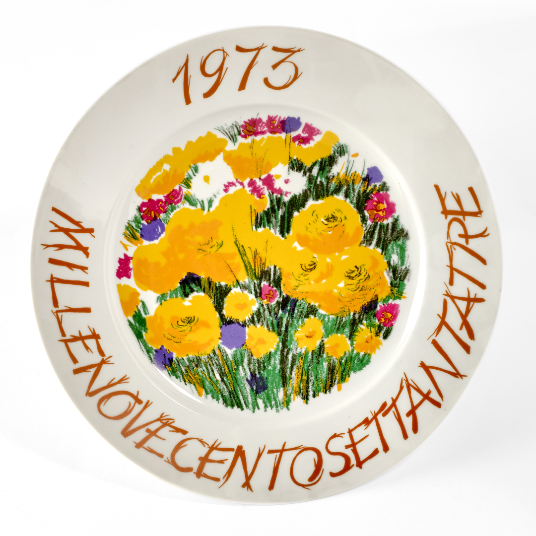 Assieme: Michele Cascella, Piatto dell'anno, 1973, ceramica serigrafata, ed. 50/500, 25,00 x 25,00 cm, datato al recto, firmato al verso.