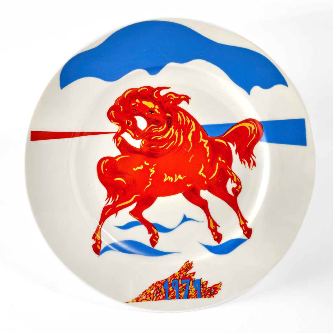 Lotto completato da: Aligi Sassu, Piatto dell'anni, 1979, ceramica serigrafata, ed. 31/500, 25,00 x 25,00 cm, datato al recto, firmato al verso.